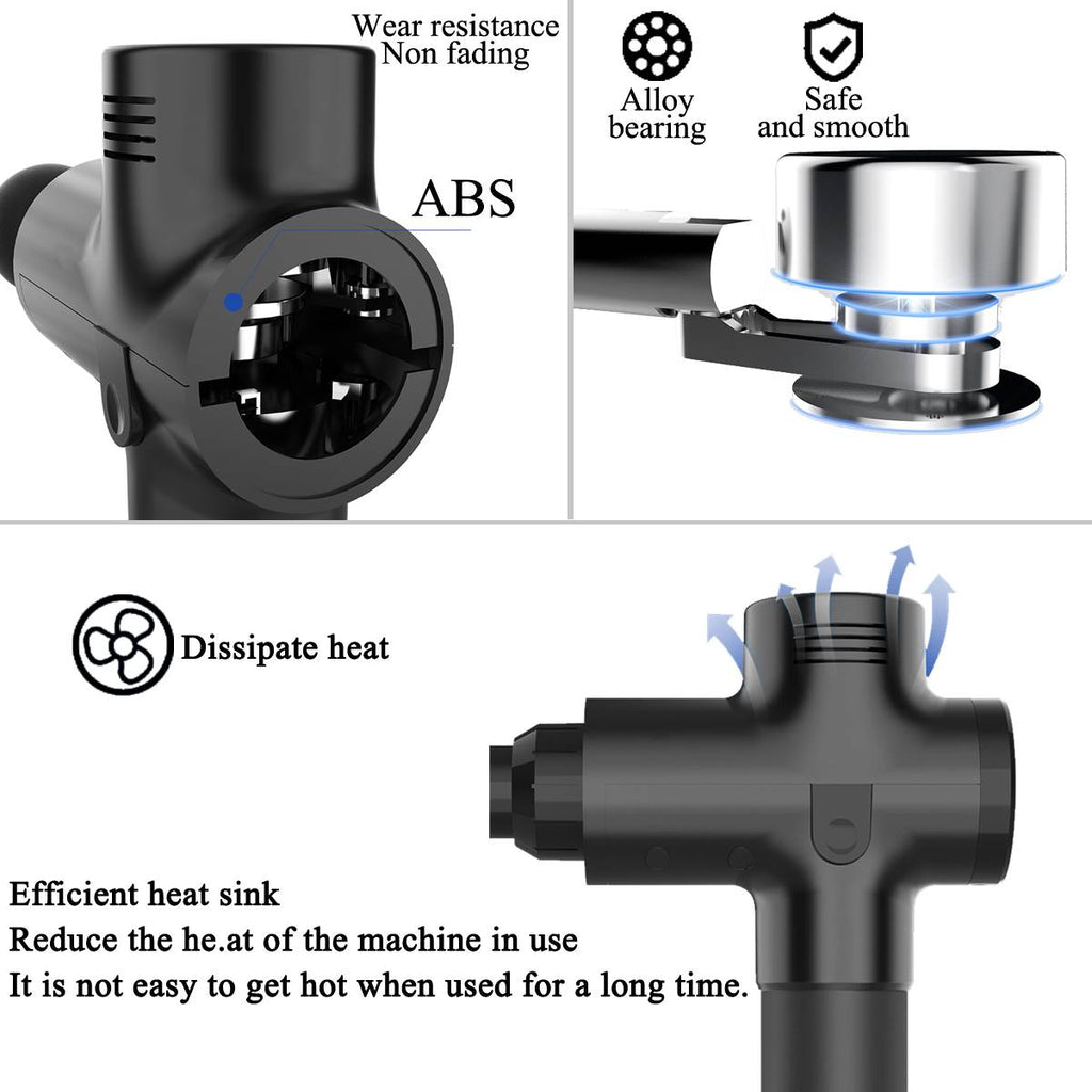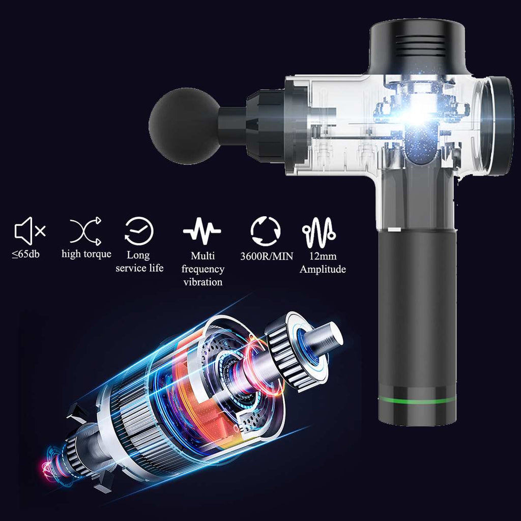 It is quiet. Whisper quiet when compared to other massage guns. So just relax and enjoy the quiet massage! Compact and lightweight, the massager is designed to be flat, small, and easy to be carried arround. The muscle massager uses pulsating vibrations to provide benefits for health. Brings tired body Restore vitality.