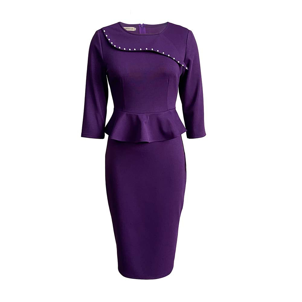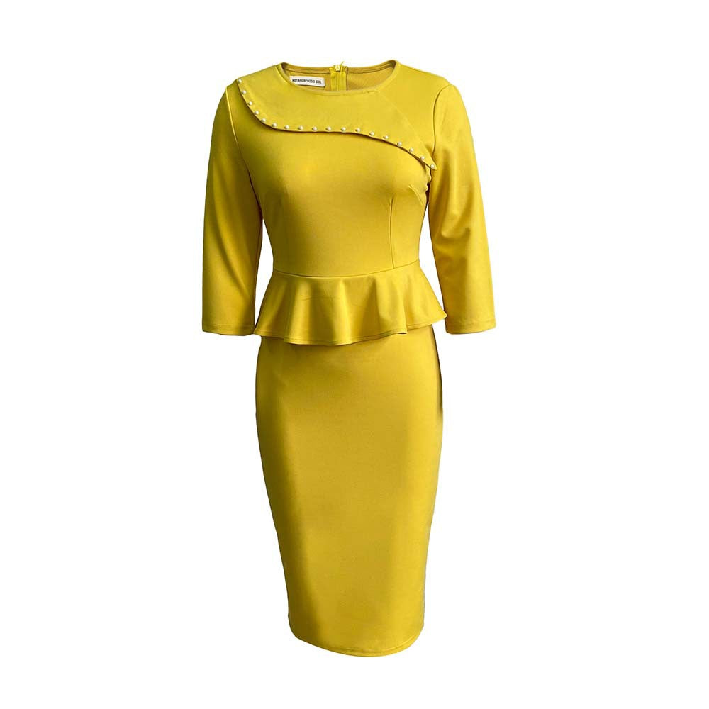 Kleiden Sie sich, um bei der Arbeit oder beim Abendessen zu beeindrucken, in diesem Set aus formellem Schößchen-Oberteil und Bleistiftrock für Damen. Es verfügt über ein dramatisches Schößchen-Top mit geschwollenen Schultern und einer gerafften Taille sowie einen schmeichelhaften Bleistiftrock.