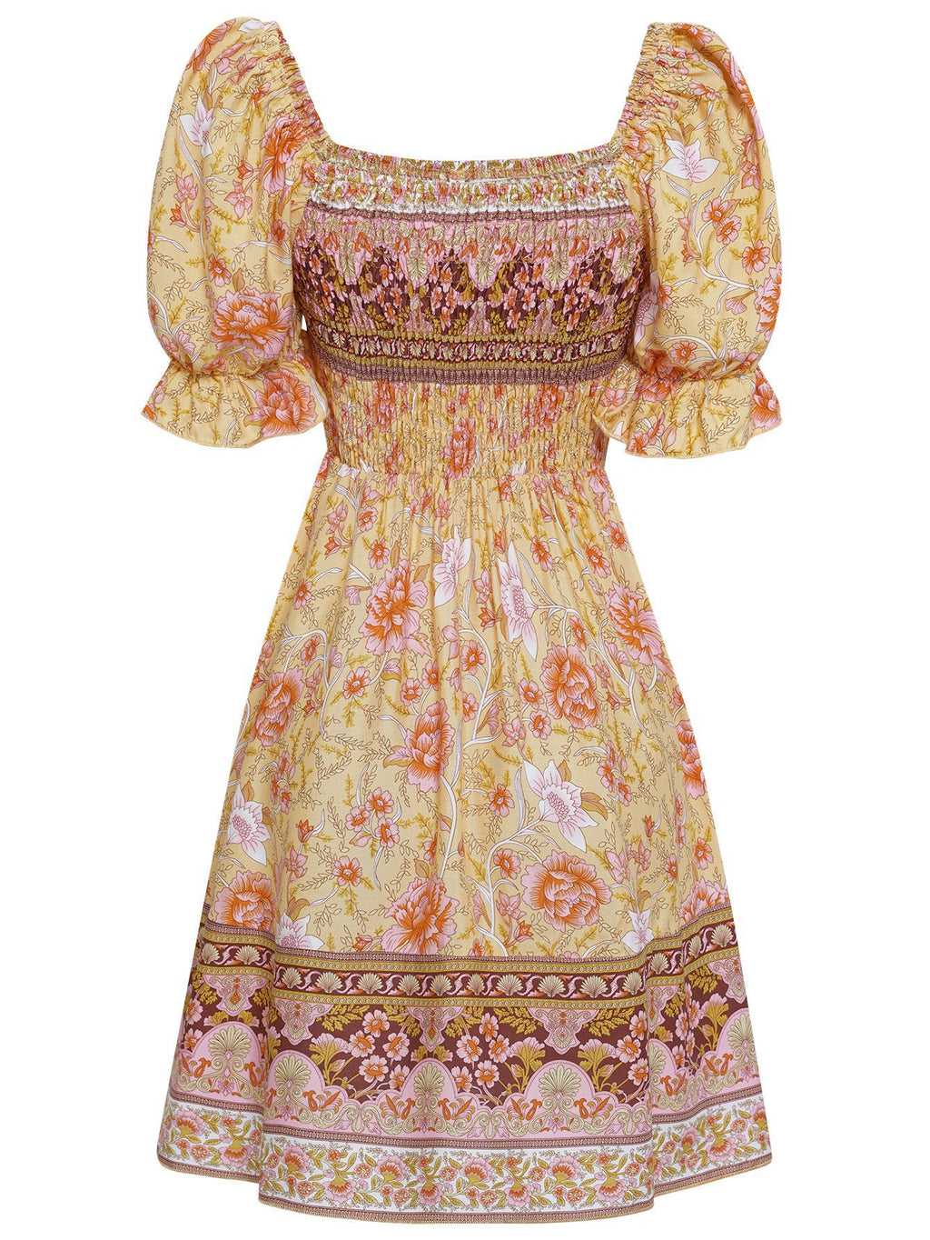Drücken Sie sich mit dem Boho -Chic -Kurzarm -Mini -Sonnenbrenner der Damen -Boho -Chic mit einem landesschicken Muster und geschwollenen Deiche aus. Wählen Sie aus einer von drei Farb- und Musteroptionen.
