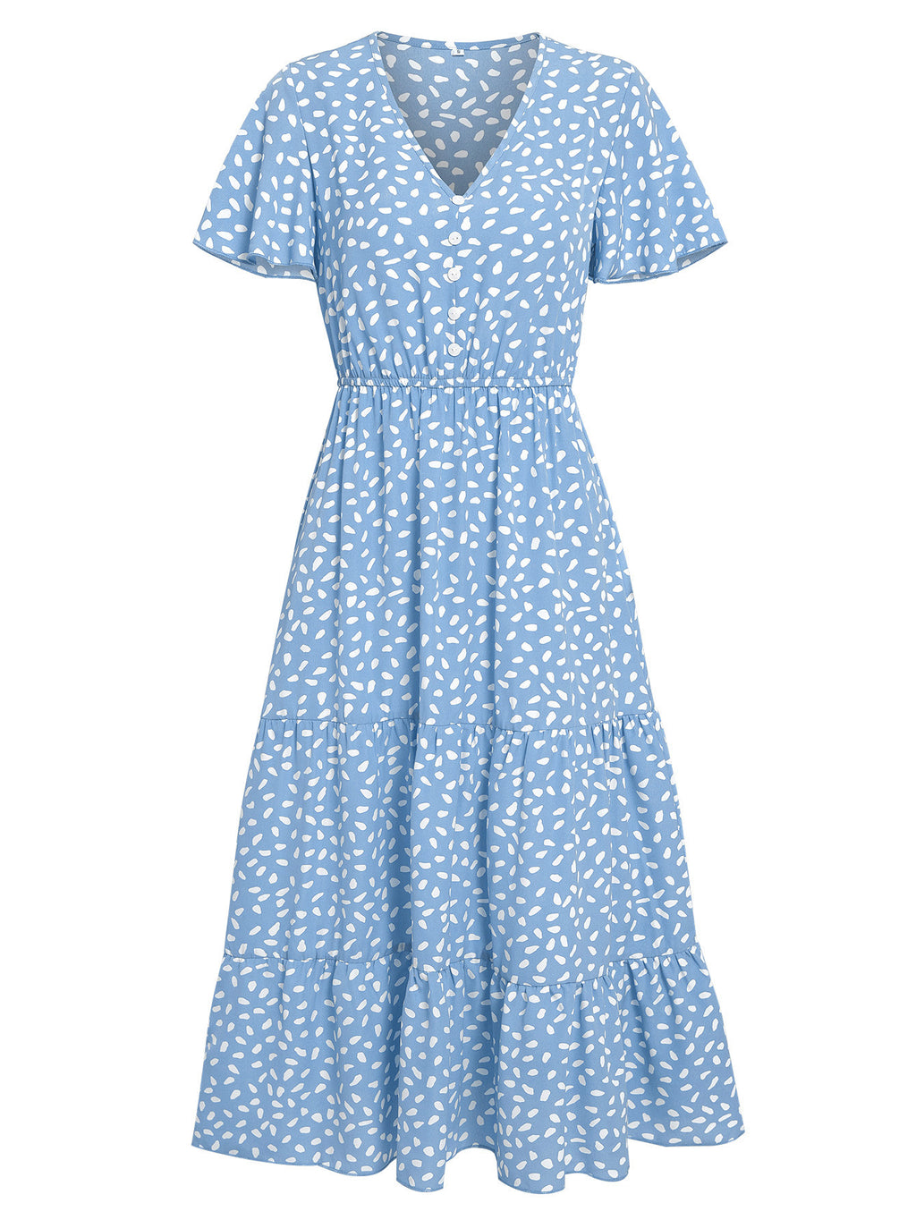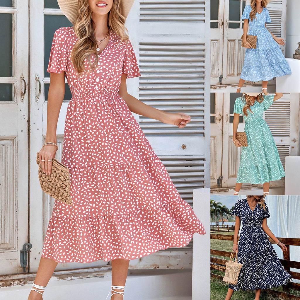 Zeigen Sie Ihren freien Geist in diesem Sommer mit dem Kleid von Frauen mit kurzem Ärmel. Dieses gemusterte Kleid ist in den Farboptionen Pink, Blue, Seafoam und Black erhältlich.