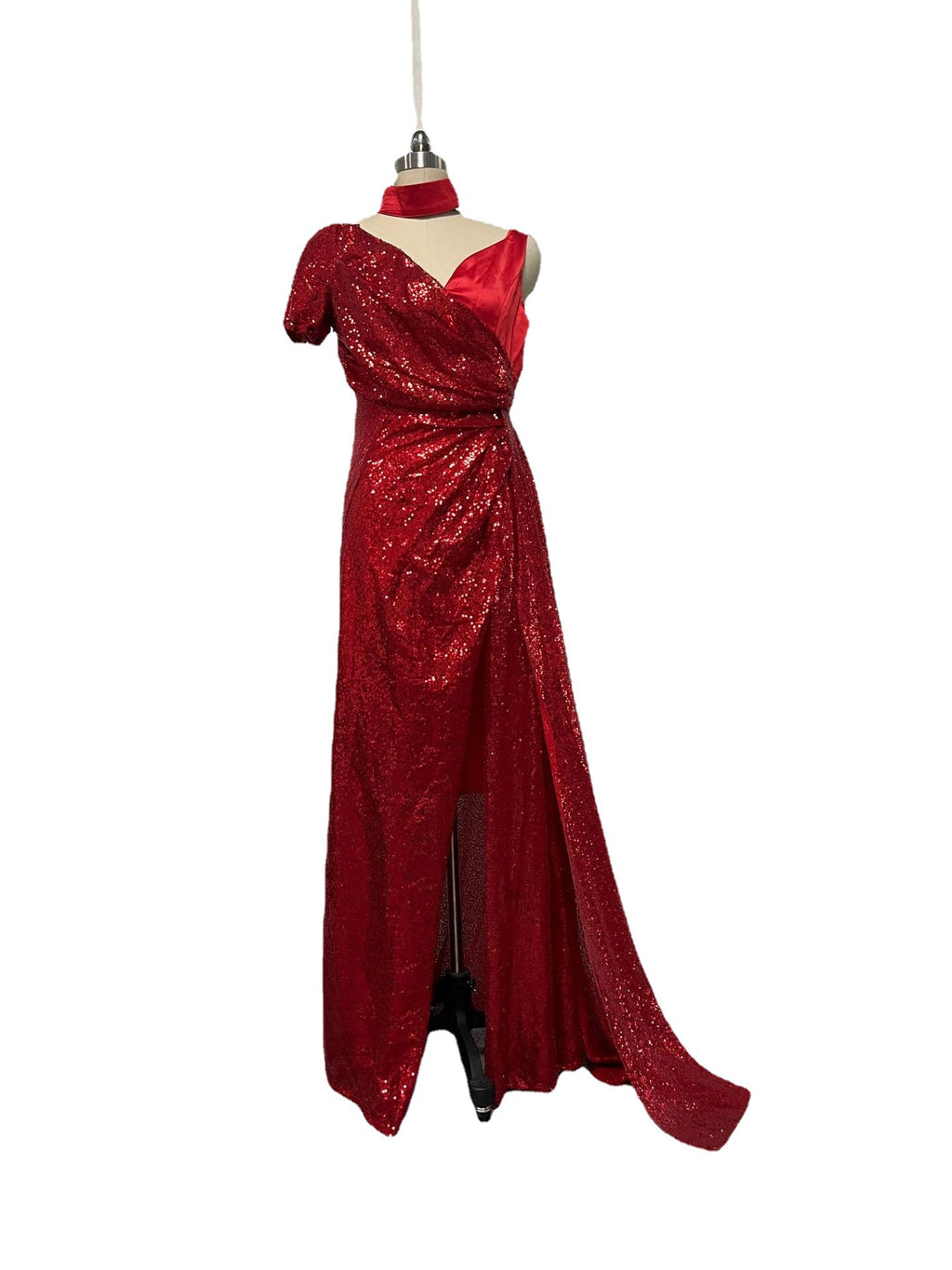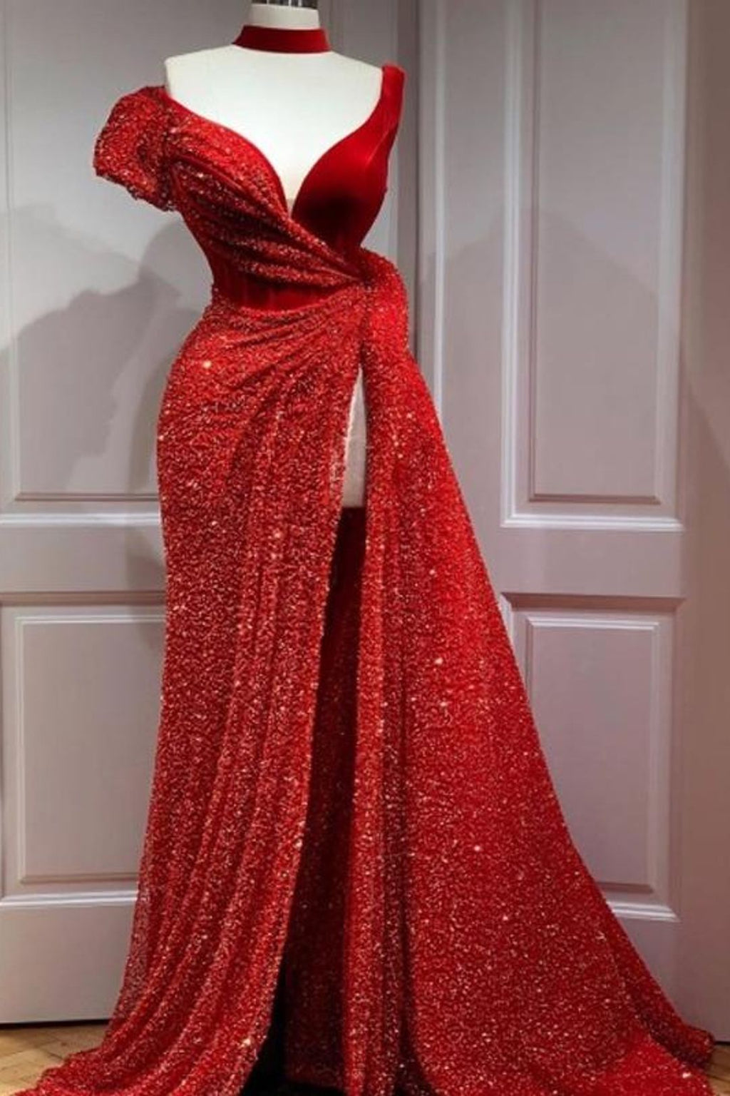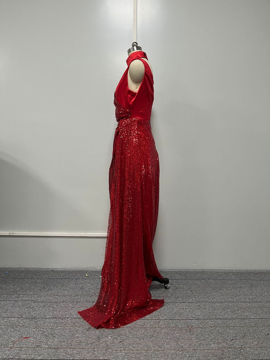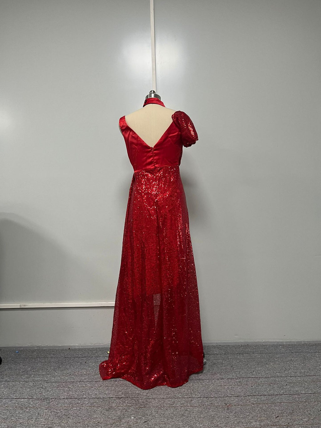 Flirtend und verführerisch hebt sich das schulterfreie Damen-Maxikleid mit hohem Oberschenkelschlitz und V-Ausschnitt von den anderen ab. Es hat einen einzigartigen Halsband im Choker-Stil und lässt sich an einer Hüfte hochziehen, um Ihrer Silhouette eine dramatische Note zu verleihen.