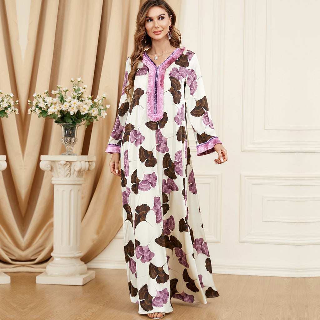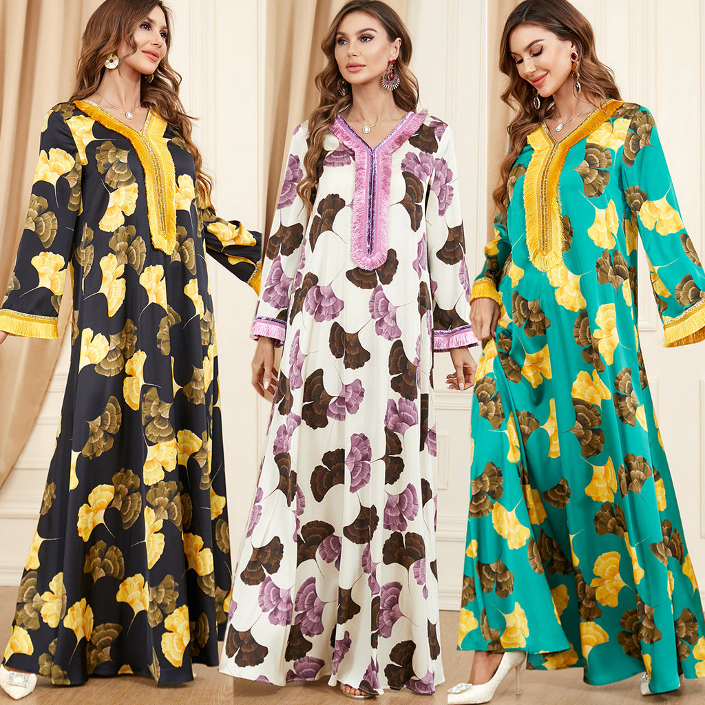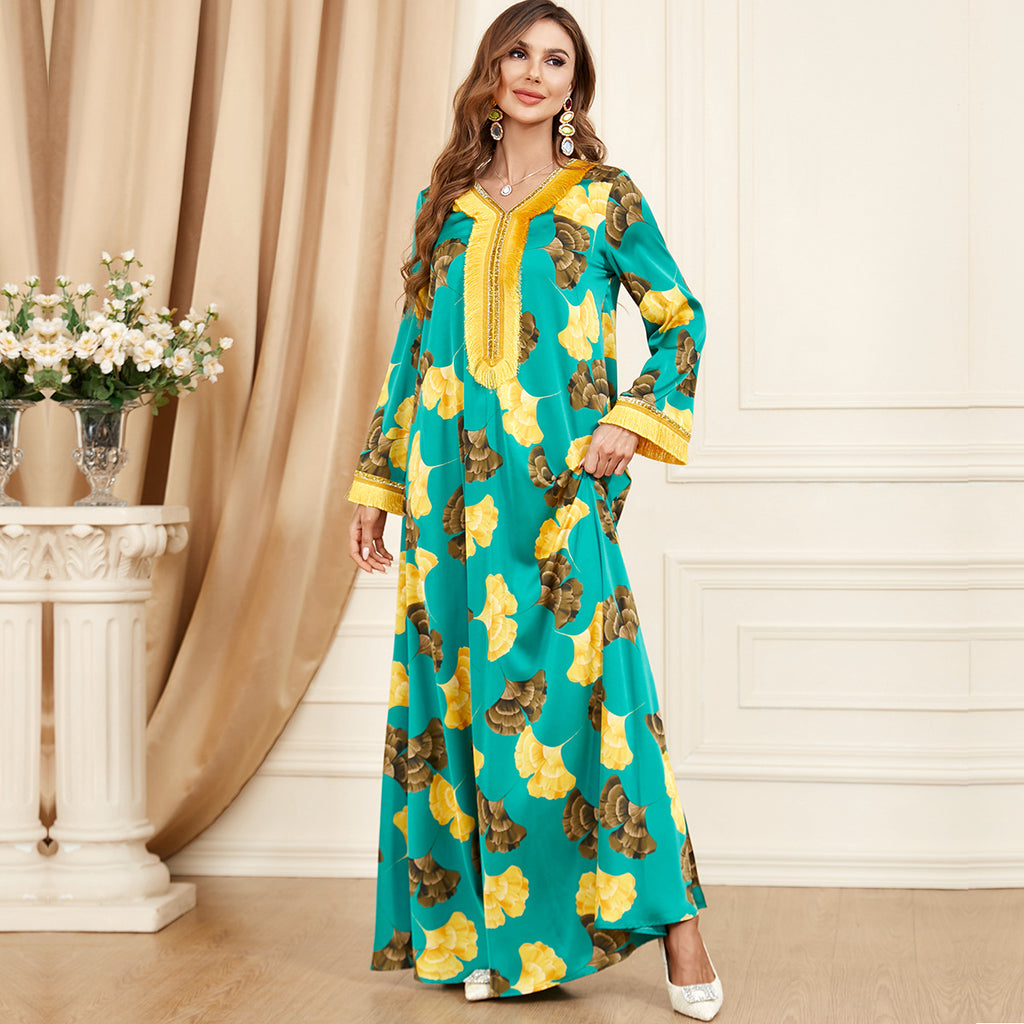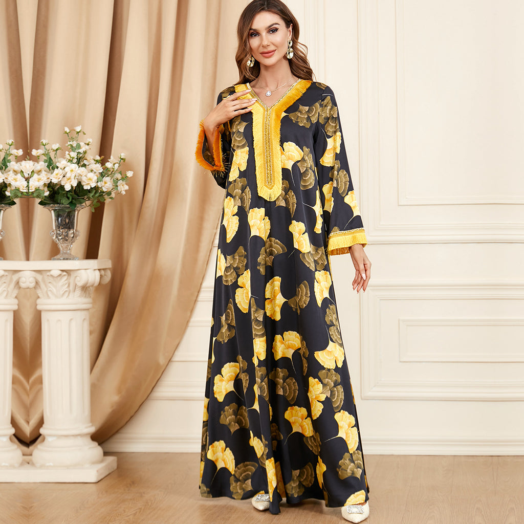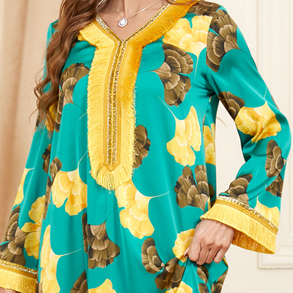 Stand out in the eye-catching Women's Dark Blue Maxi Dress with Golden Leaf Pattern and Gold Tassels, providing a sophisticated color combination.