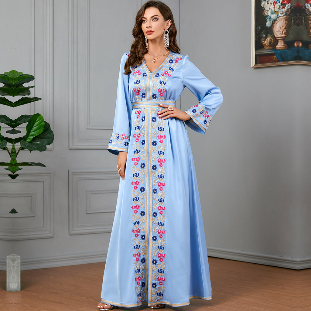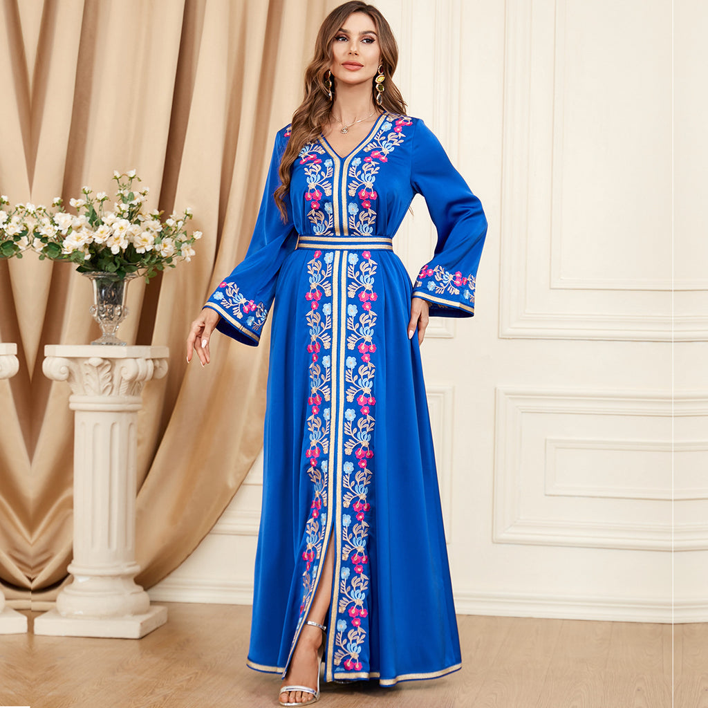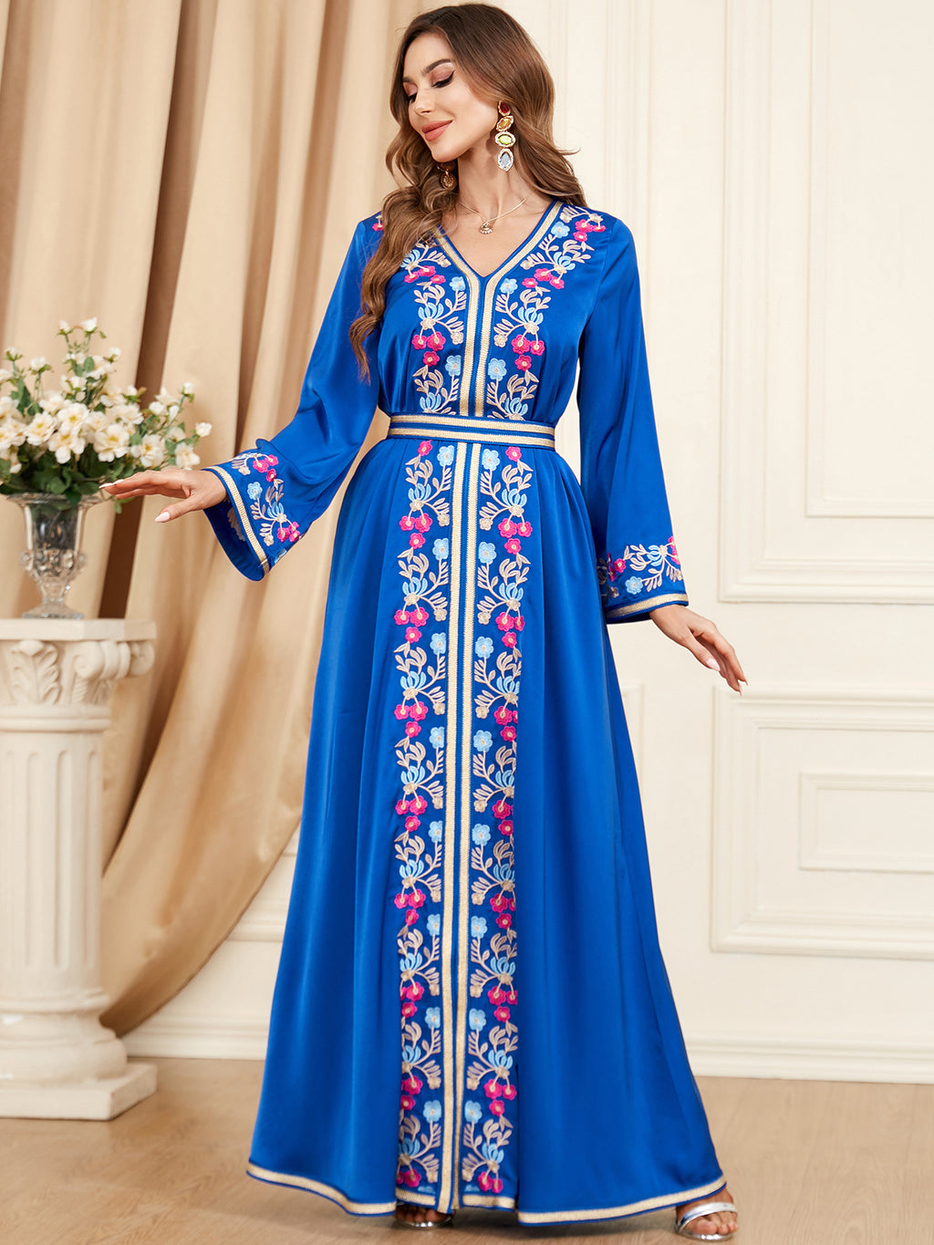 Colorful and vivid, the Women's Long Sleeve Midnight Blue Floral Maxi Dress features vibrant hot pink and sky blue floral details for a well-rounded appearance.