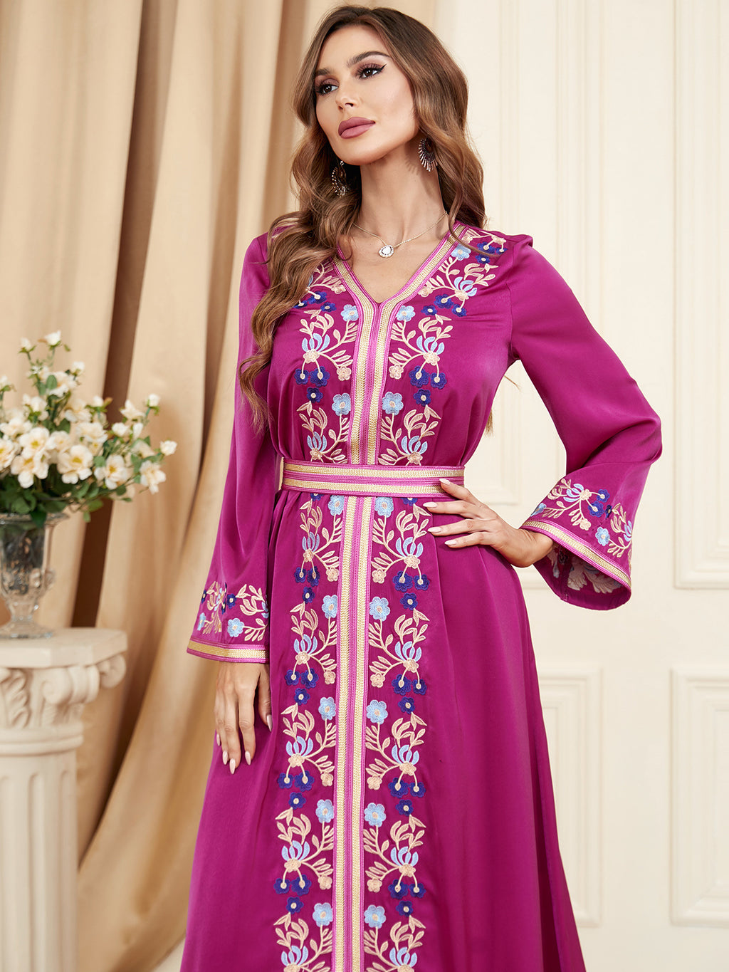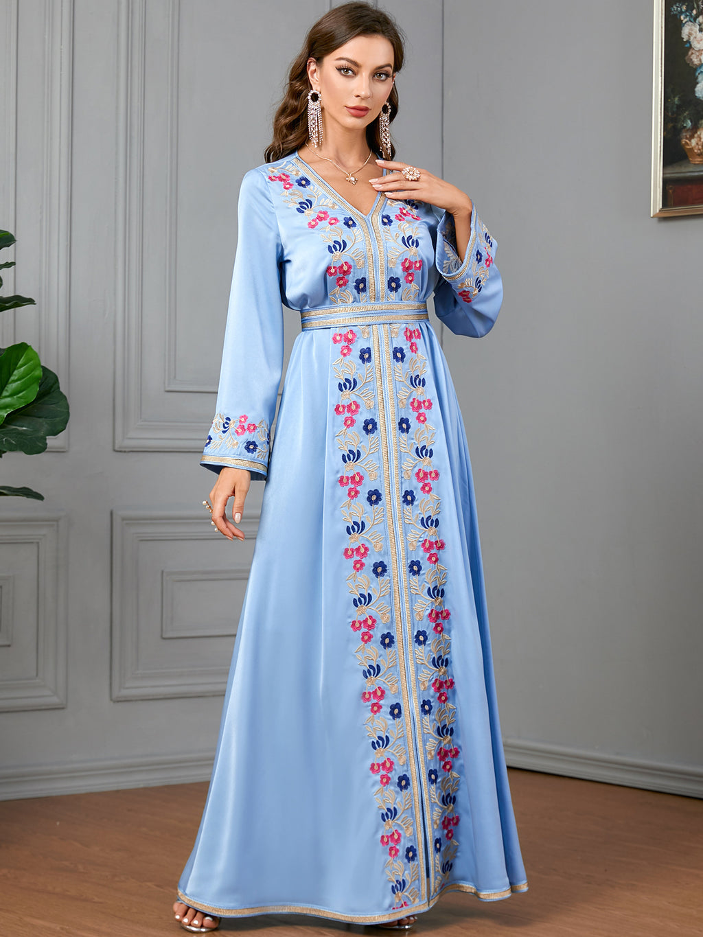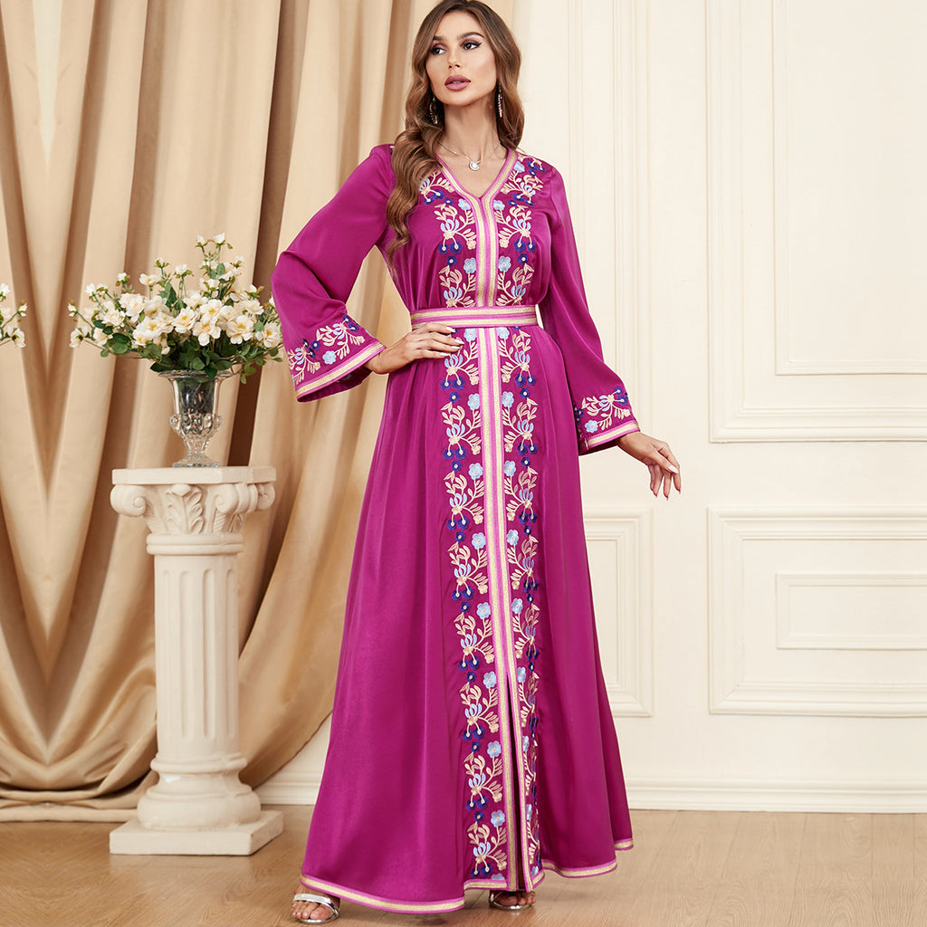 Colorful and vivid, the Women's Long Sleeve Midnight Blue Floral Maxi Dress features vibrant hot pink and sky blue floral details for a well-rounded appearance.