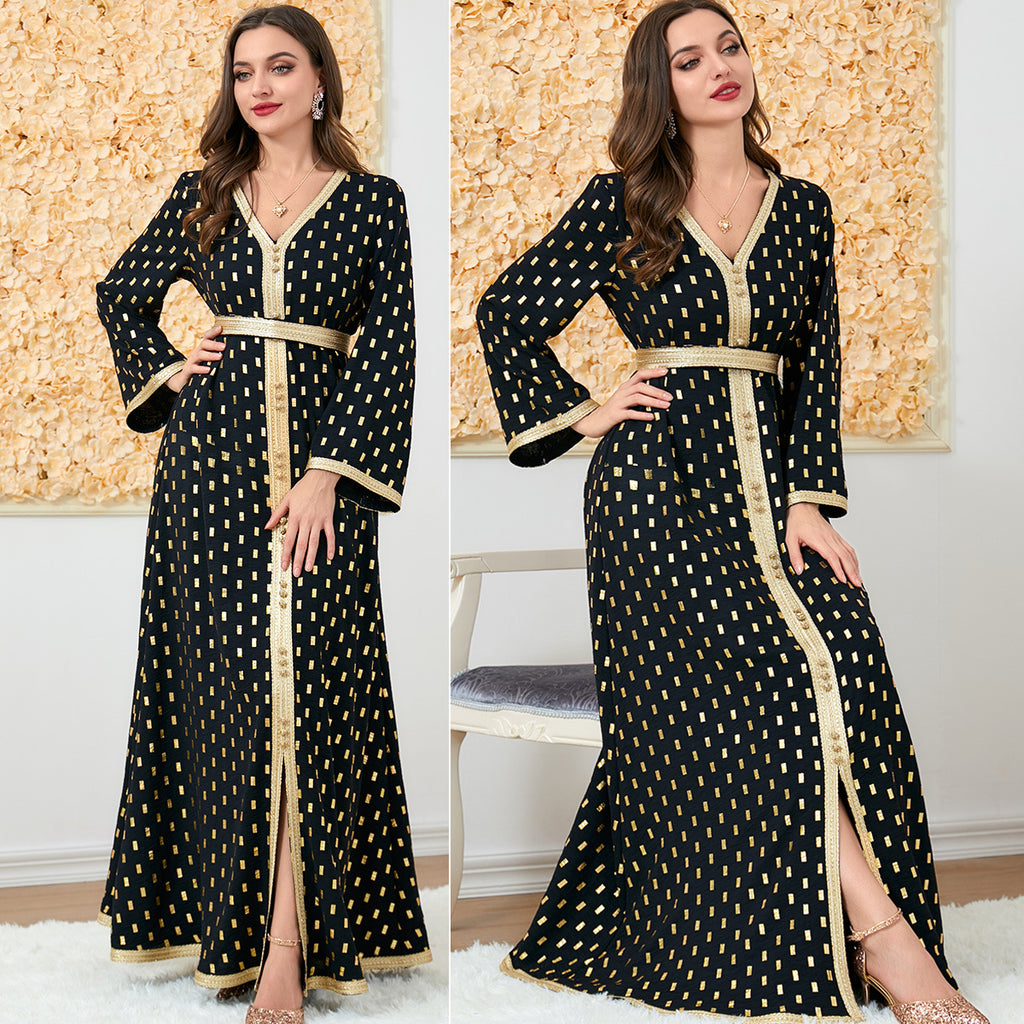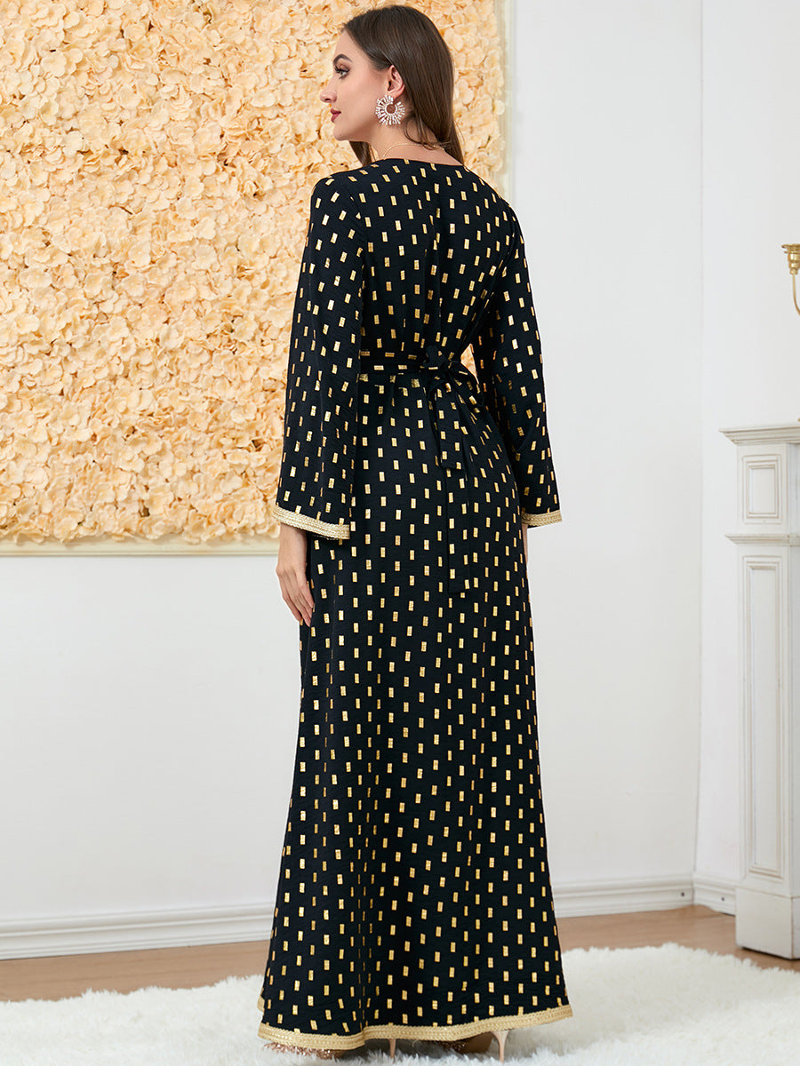 Grab attention in the shimmering Women's Long Sleeve Navy Blue Maxi Dress complete with golden polka dots and a golden split down the center.