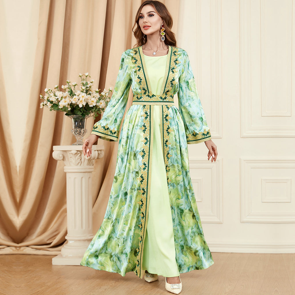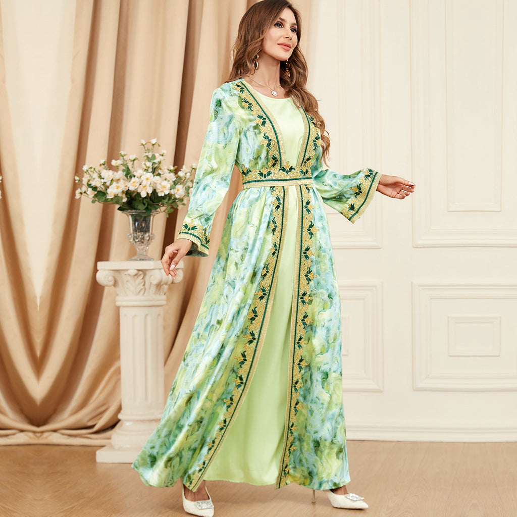 Bring a regal look to your nighttime wardrobe by wearing the Women's Mint and Navy Blue Maxi Gown complete with sophisticated gold trim.