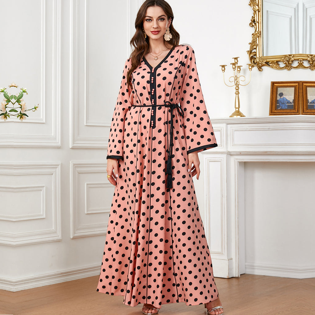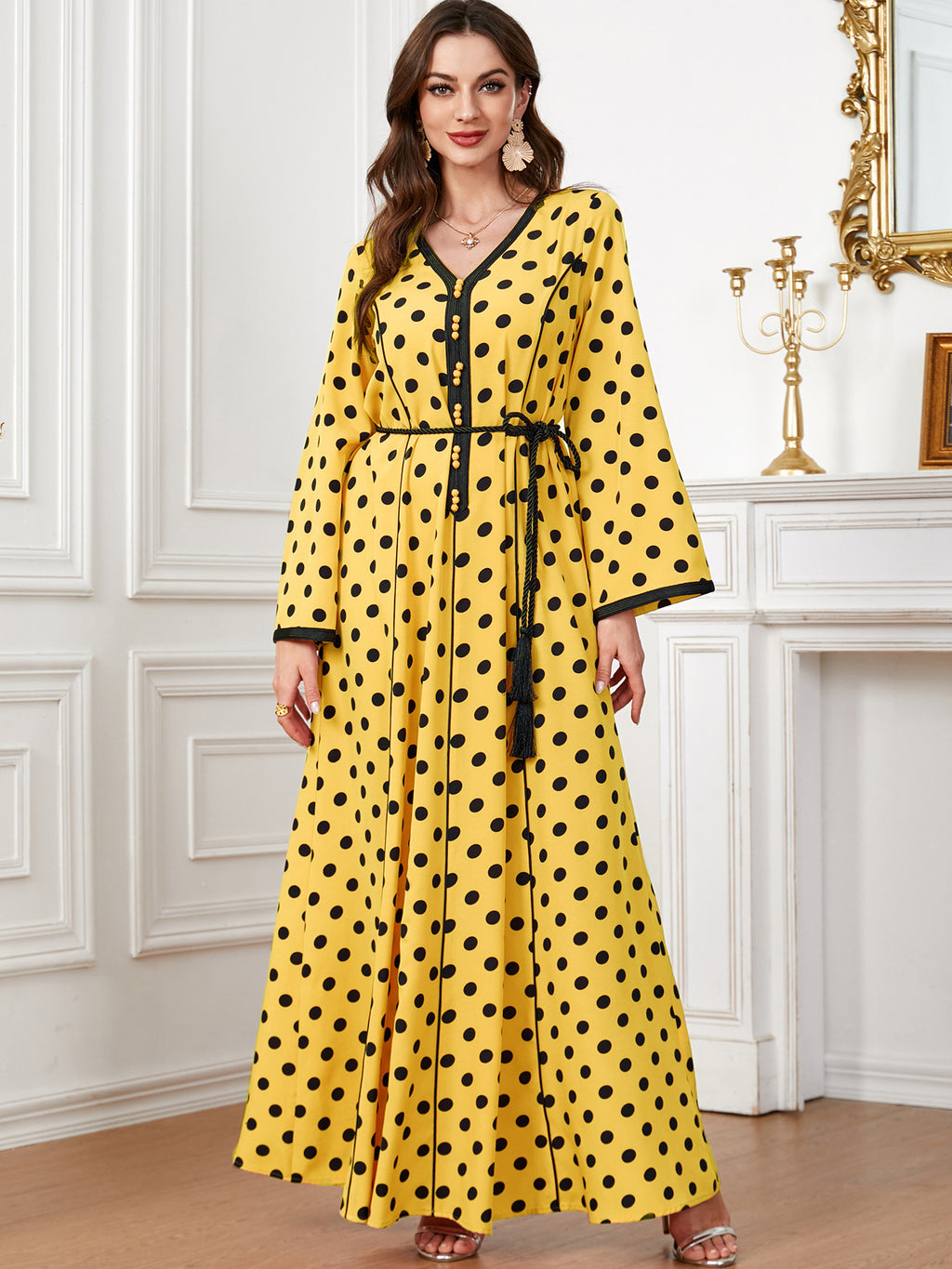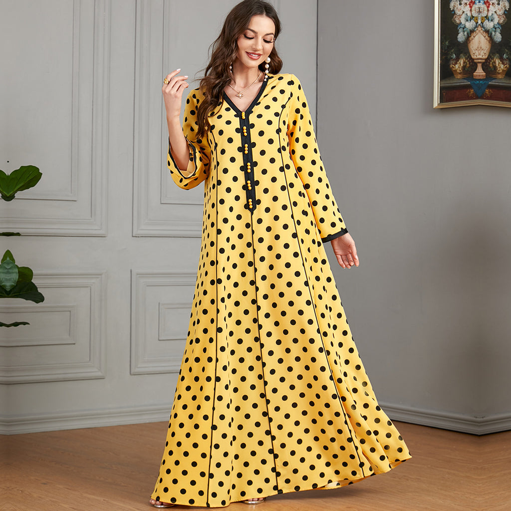 Women's Pale Yellow Maxi Dress with Black Polka Dots