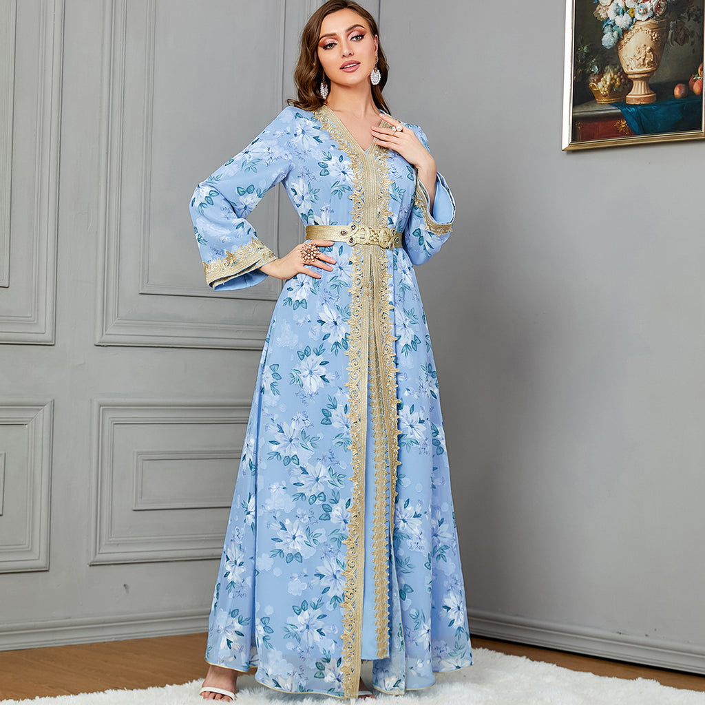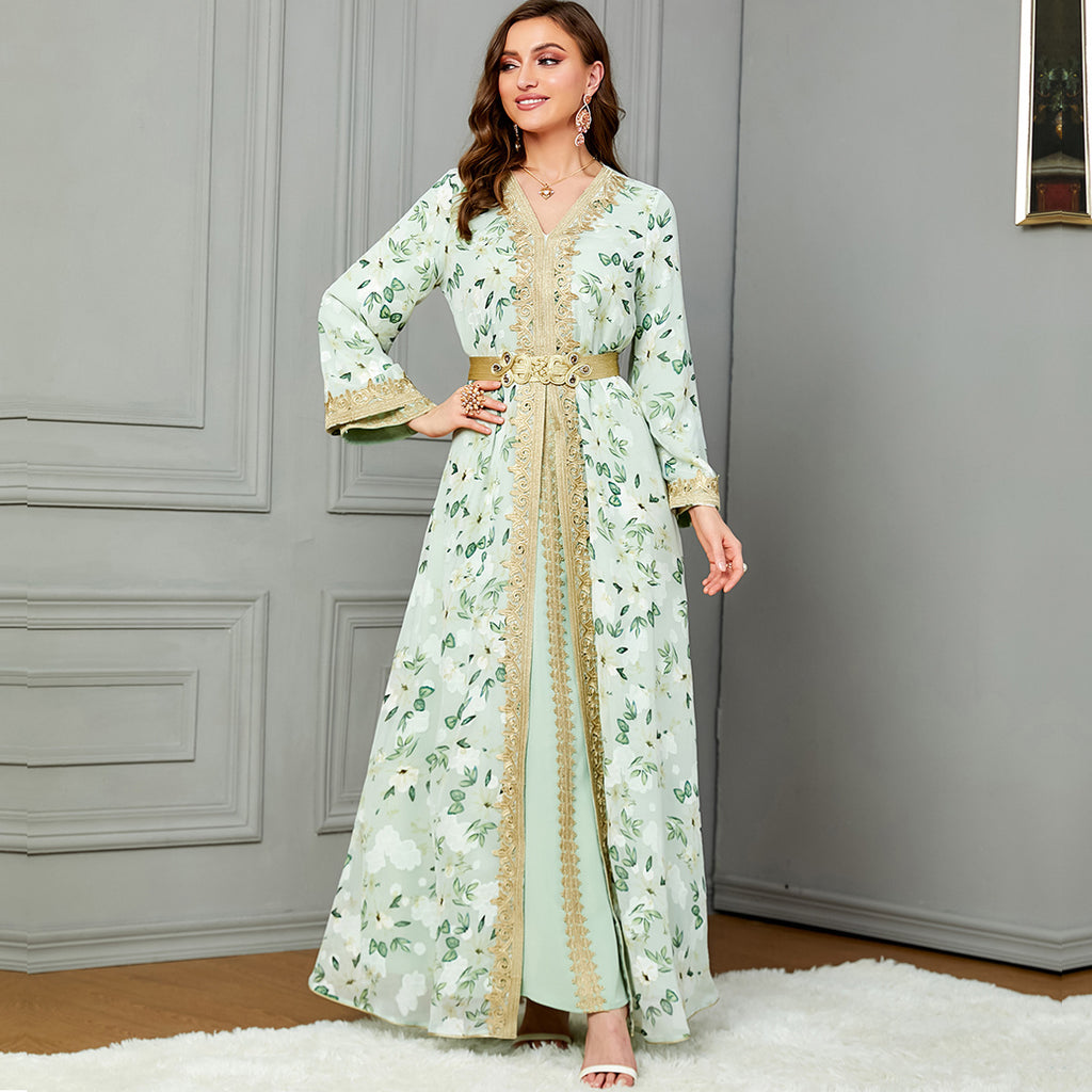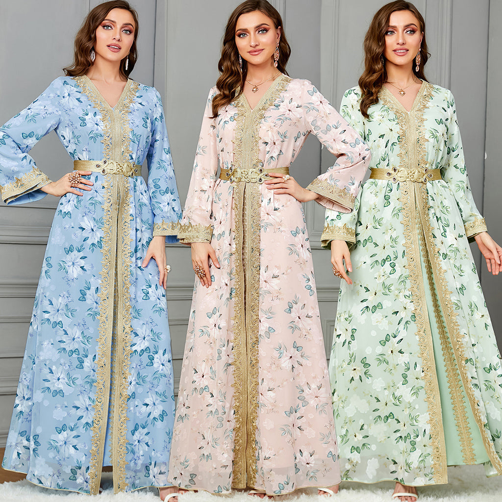 Women's Pastel Floral Print Maxi Dress with Gold Trim