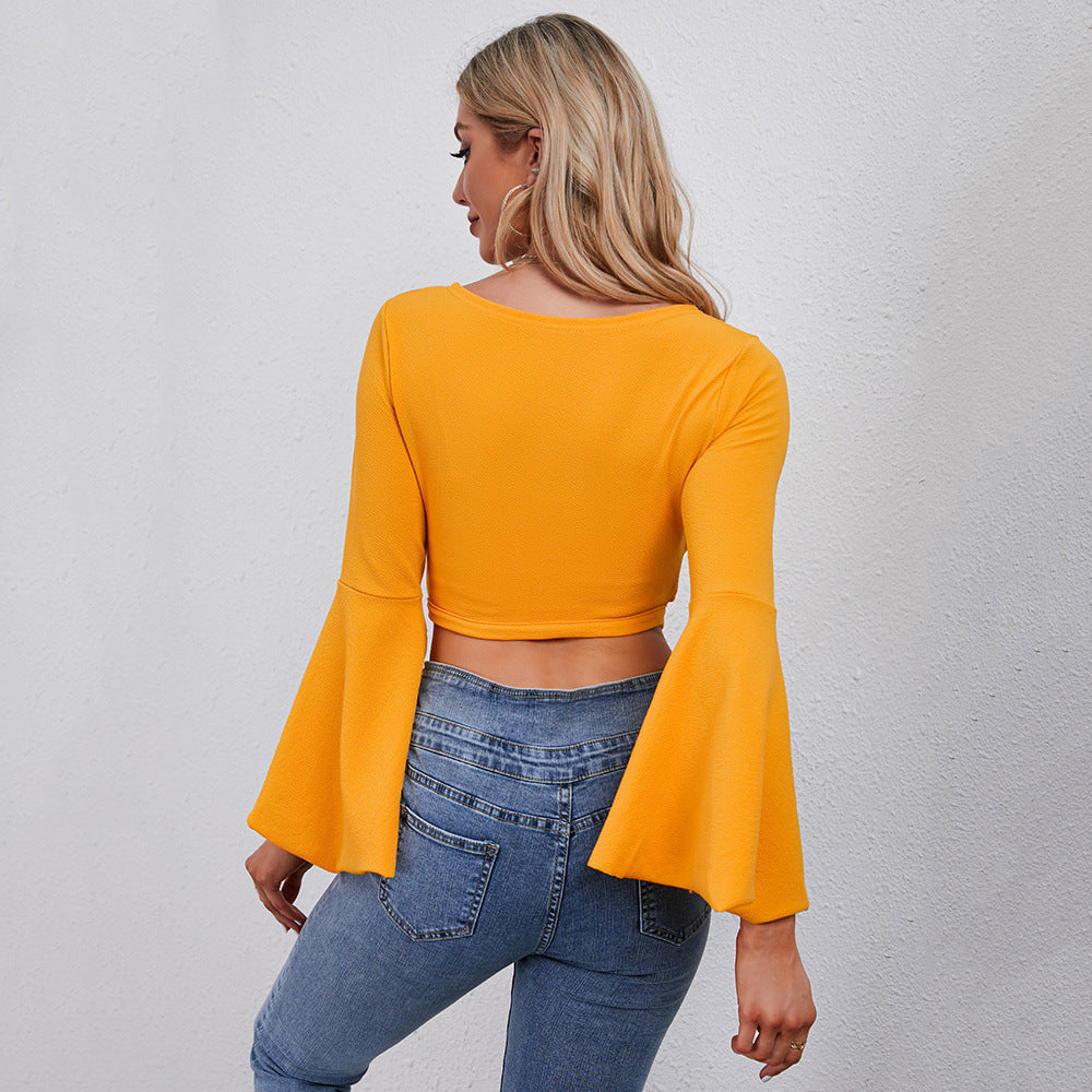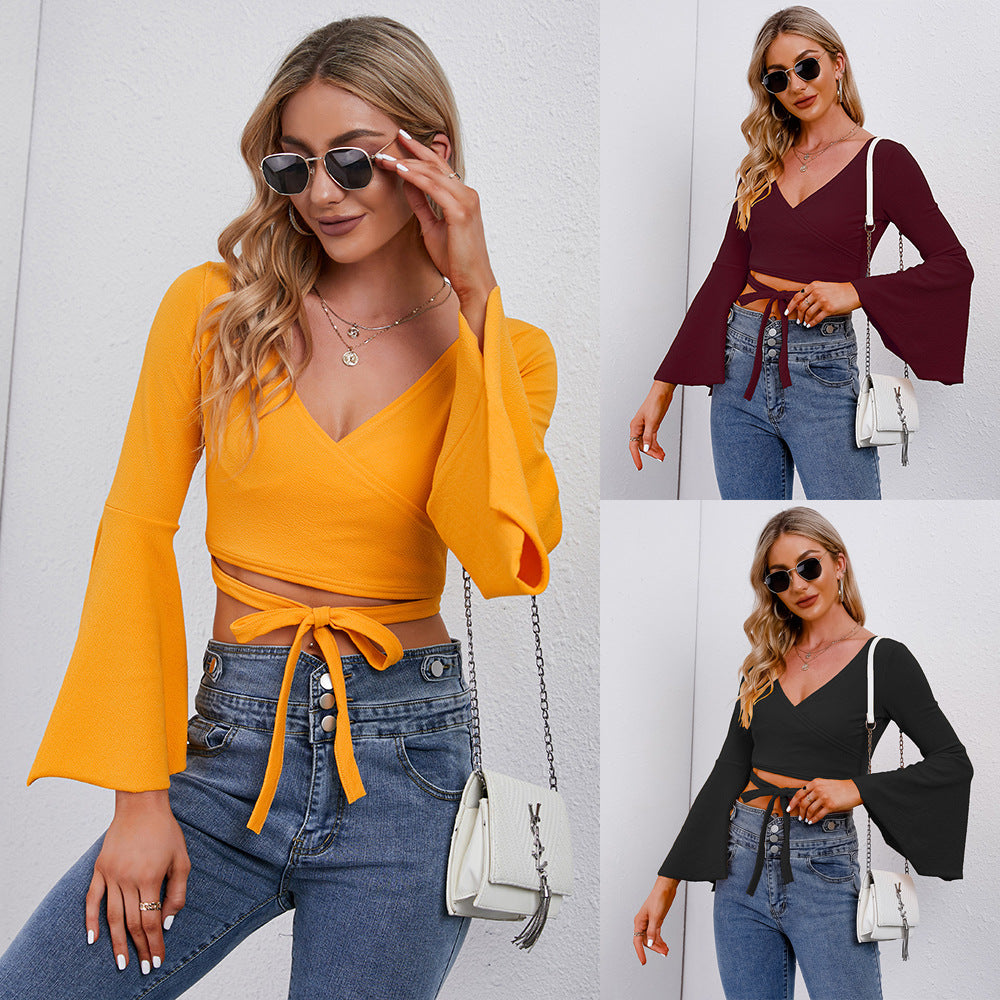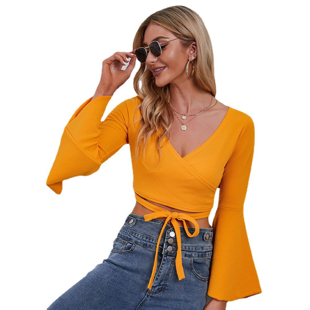 Look colorful and free this spring in the Women's Long Bell Sleeve Crop Top with Ribbon Tie. It features a small V neck to give the top a flirtatious touch.