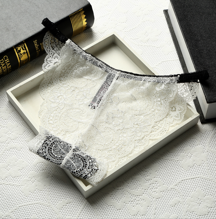Agregue un poco de misterio a sus noches con su amante usando esta ropa interior de encaje de estilo breve de cobertura completa que presenta un detalle de encaje ligeramente transparente y una cintura alta.