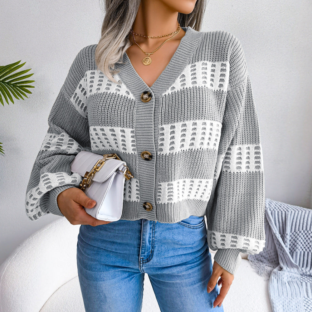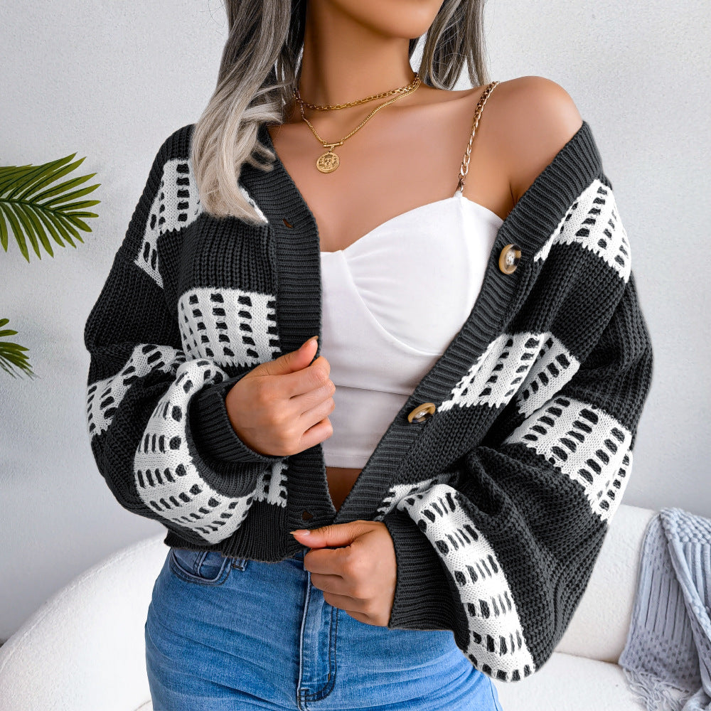 Vístase de manera informal y abrigada este otoño con el suéter holgado para mujer con botones y mangas de gran tamaño. Presenta rayas blancas con separadores grises, negros o marrones y se puede usar abierto o cerrado.
