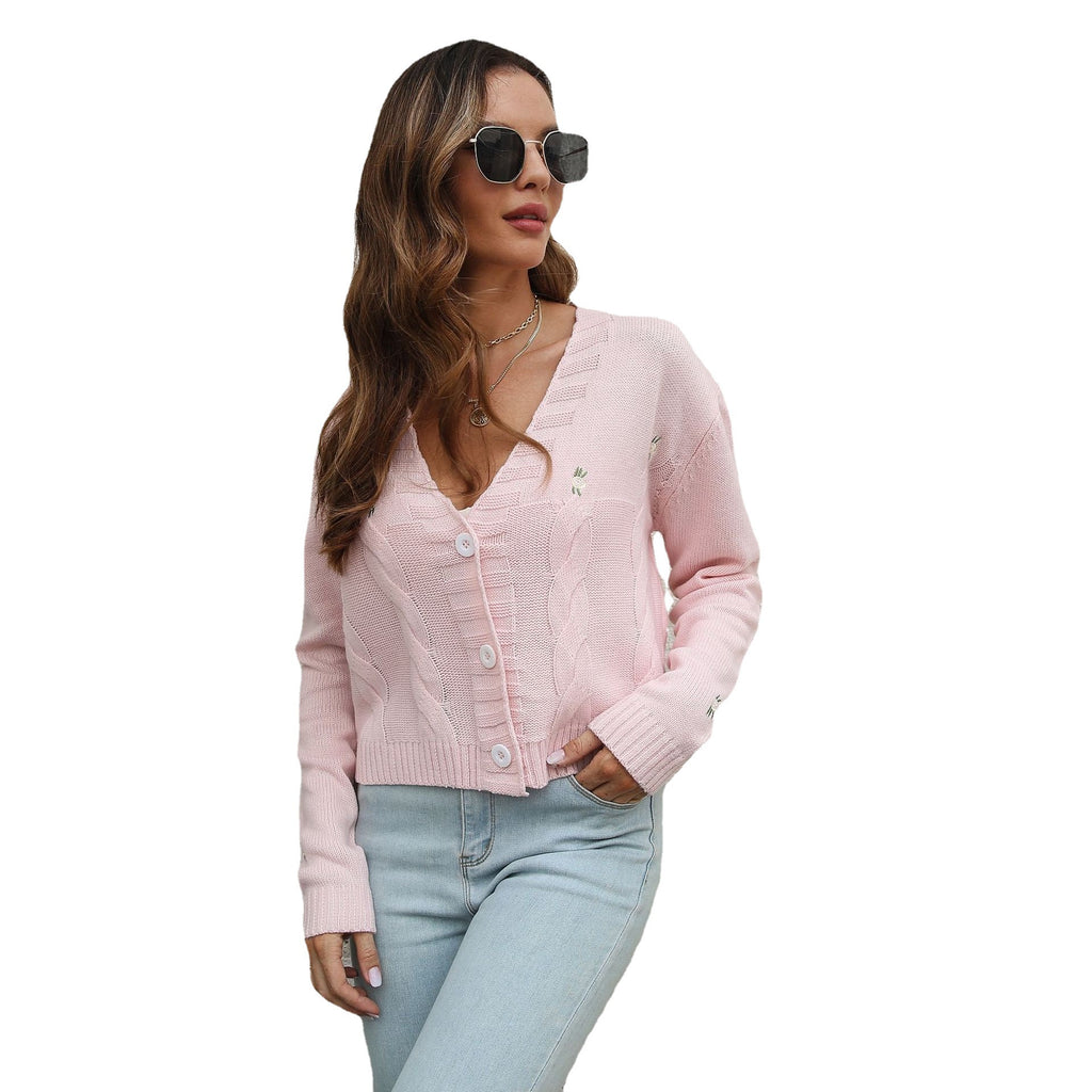 Suéter abotonado de manga larga con cuello en V y detalles de punto