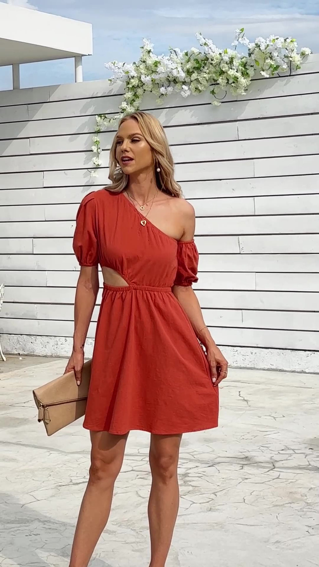 Robe el espectáculo en el brunch y más allá de usar el mini vestido de manga corto asimétrico de las mujeres con un top de estilo diagonal y una minifalda fluida con mangas asimétricas.