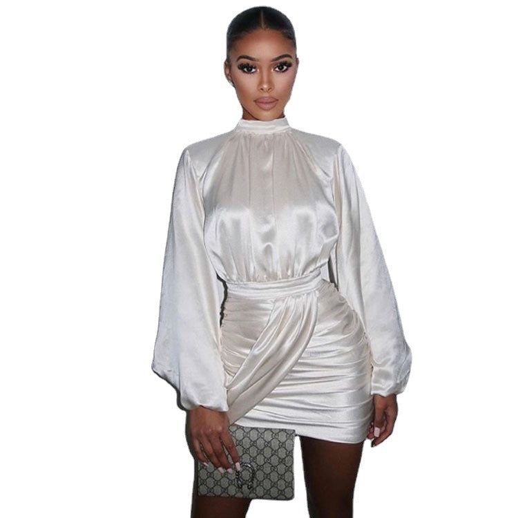 मॉक नेक के साथ महिलाओं की लंबी पफ स्लीव मिनी ड्रेस