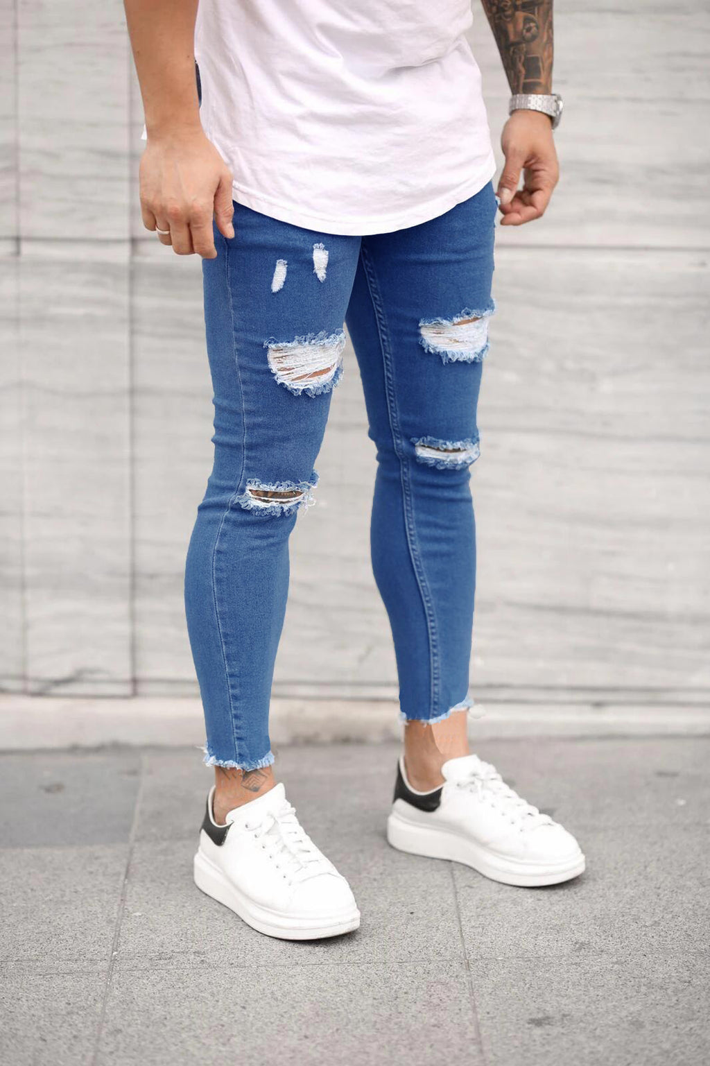 रिप्स और आँसू के साथ डेनिम जींस पहने हुए सरल अभी तक स्टाइलिश आकस्मिक पहनावा बनाएं। इन जीन्स में एक तंग फिटिंग स्किनी स्टाइल है जो टखनों के चारों ओर रुकती है और जांघों और घुटनों के साथ चीर होती है।