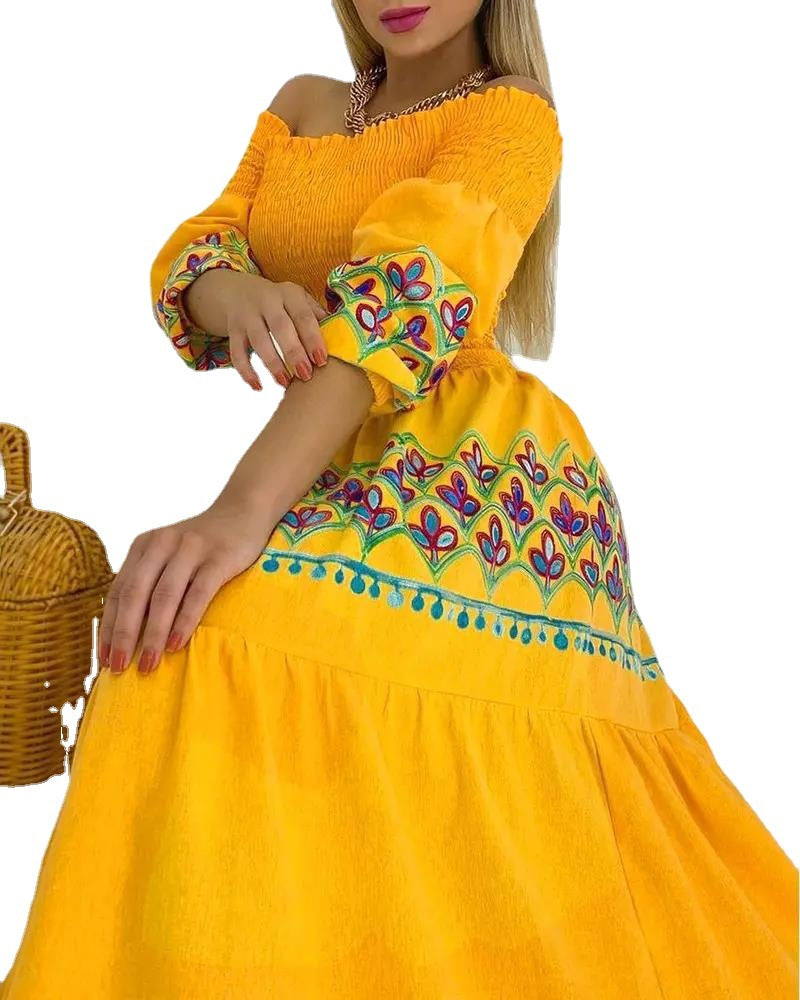 महिलाओं की मैक्सिकन स्टाइल वाइब्रेंट गाउन तीन क्वार्टर लंबाई स्लीव्स के साथ