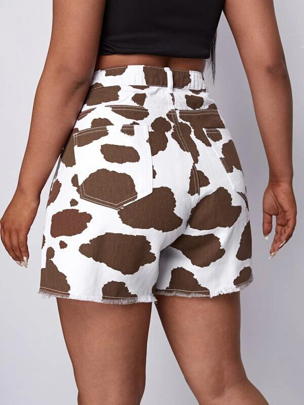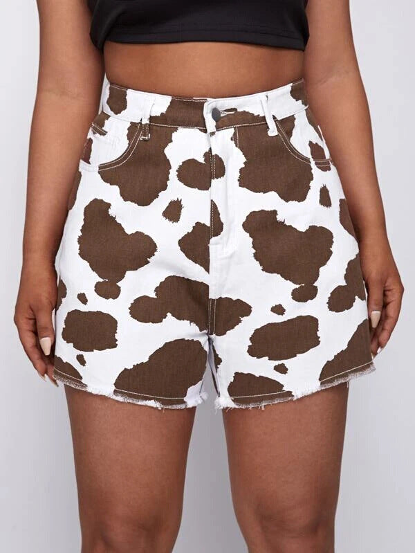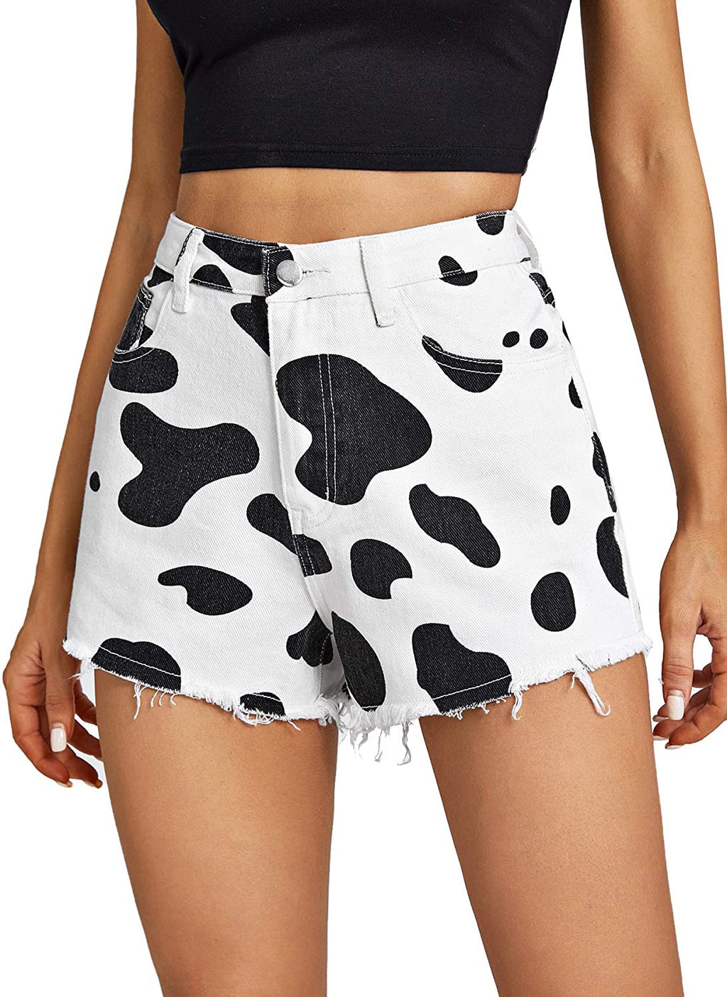Unik dan imut, celana pendek pinggang tinggi wanita dengan desain cetak sapi menambah imajinasi pada ansambel apa pun. Celana pendeknya datang dalam pilihan cetakan hitam dan putih atau coklat dan putih.