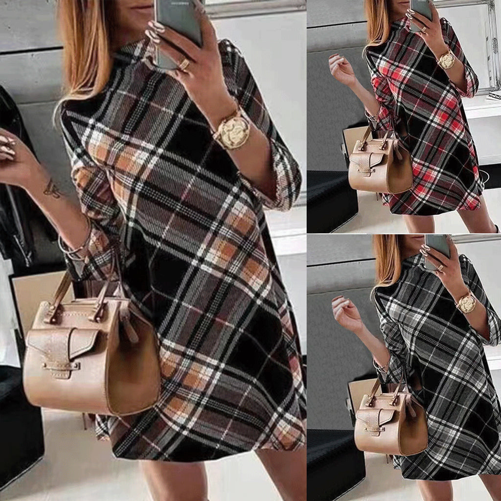 Gaun mini kotak -kotak dengan lengan panjang 3/4