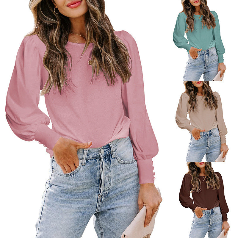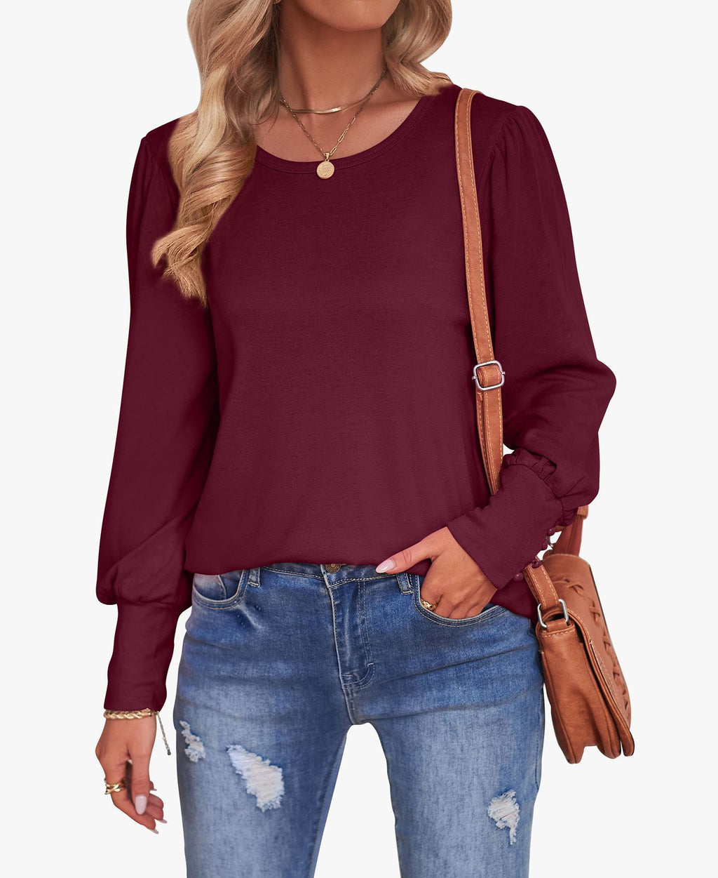Vesti il ​​tuo abbigliamento diurno casual con la camicetta allentata a maniche lunghe delle donne con scollo o. Questa semplice camicetta presenta maniche raccolte e polsi con fila che gli danno una silhouette unica.