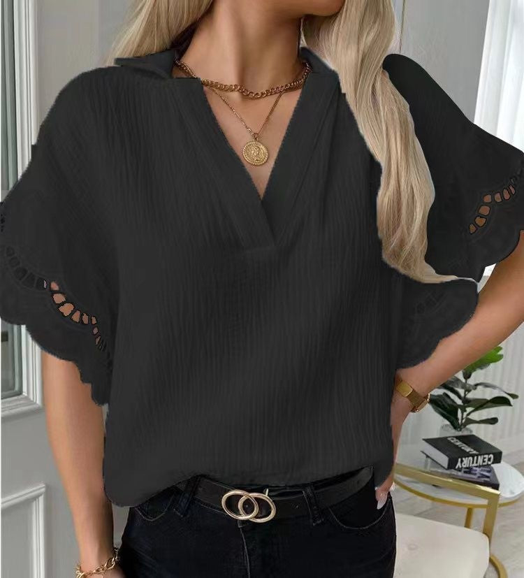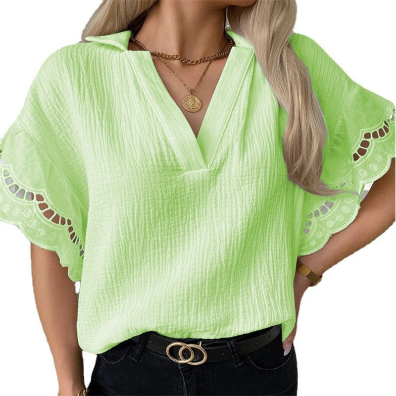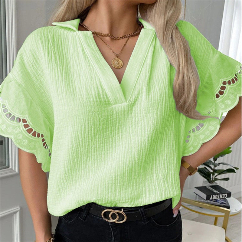 Con le sue maniche a campana di pizzo e materiale strutturato, questa camicetta con le maniche di pizzo fluttuante a V è un top semi-casuale per ogni occasione. È disponibile in uno dei tanti colori tra cui scegliere.