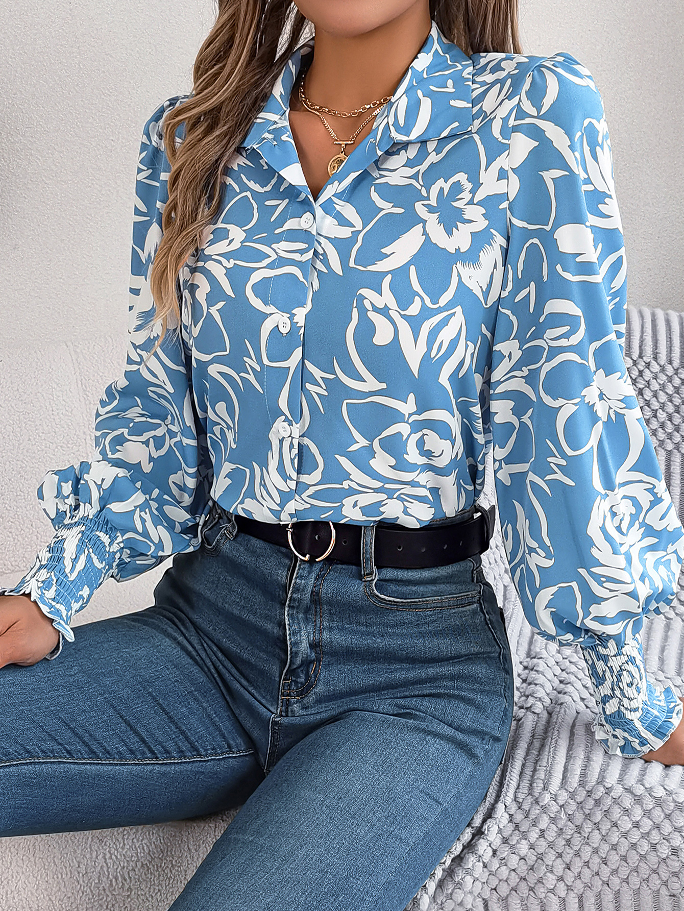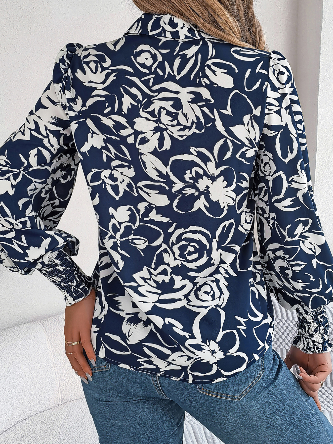Women's Elegant Color-Blocked Floral Lantern Sleeve Lapel Shirt