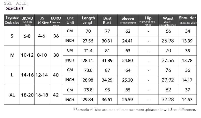 1. Asian sizes are 1 to 2 sizes smaller than European and American people. Choose the larger size if your size between two sizes. Please allow 2-3cm differences due to manual measurement. 2. Please check the size chart carefully before you buy the item, if you don't know how to choose size, please contact our customer service. 3.As you know, the different computers display colors differently, the color of the actual item may vary slightly from the following images.