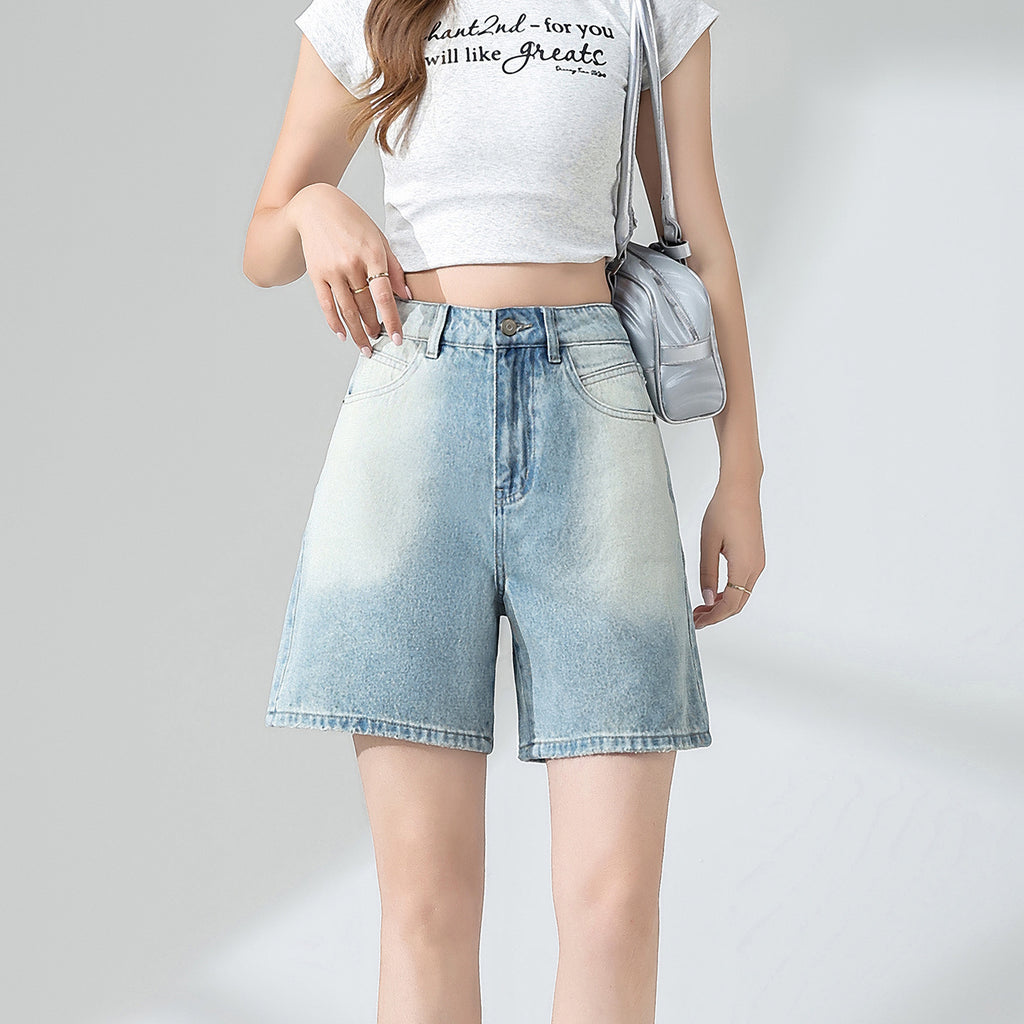 ゆるい快適さを備えたハイウエストレトロブルーデニムショーツ