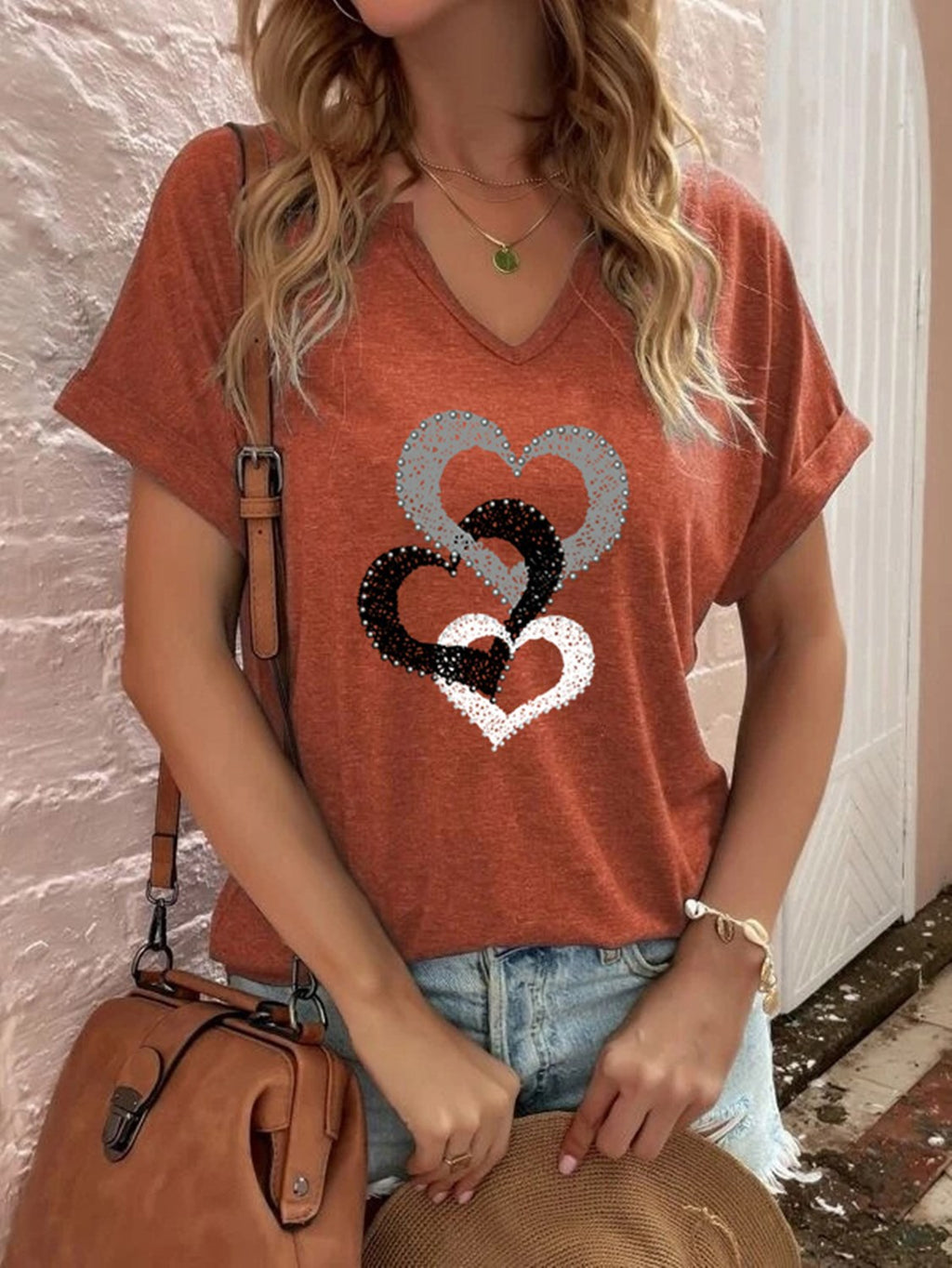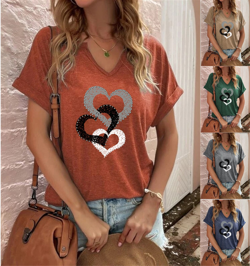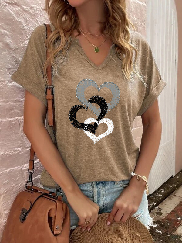 アロマンティックハートのグラフィックは、このトリプルハートソフトコットンウーマンのグラフィックブラウスの中央にあり、カラフルなシャツにかわいい仕上げを加えています。
