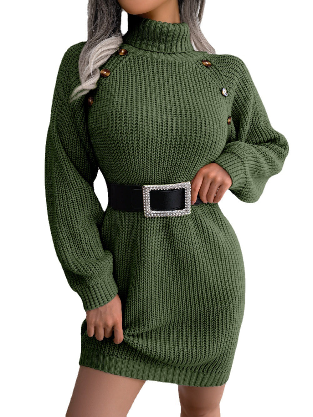 今年の冬または秋には、ボタンの詳細が付いた女性のタートルネックの冬のセーターを着て秋を見てください。ゆるいフィット感のあるセータードレスは、腰の周りにベルトを備えており、より大きな形を与えます。