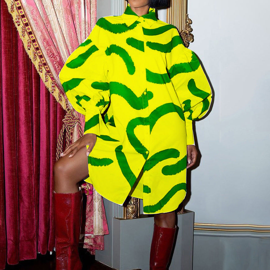 滑走路から降りて、この大胆でドラマチックな女性の抽象的なストライプのゆるいルーズフィッティングミニドレスを着て、ボタンの前に、大きな大胆な袖と模擬首を特徴としています。
