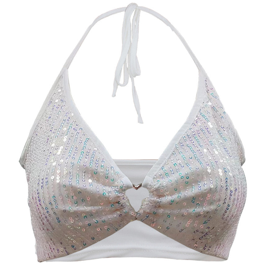 Vネックで女性のスパンコールのクロップトップを着て、どんなビーチの日もかわいく見えることがあります。それは黒または白で提供され、中央に心臓の切り抜きが特徴です。