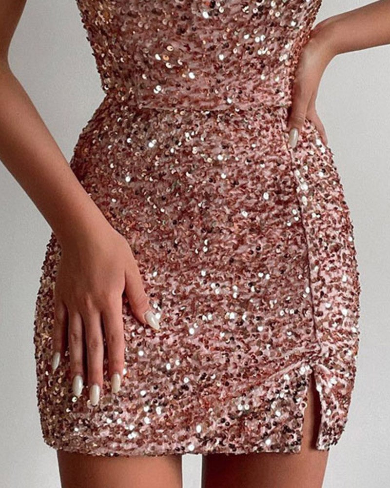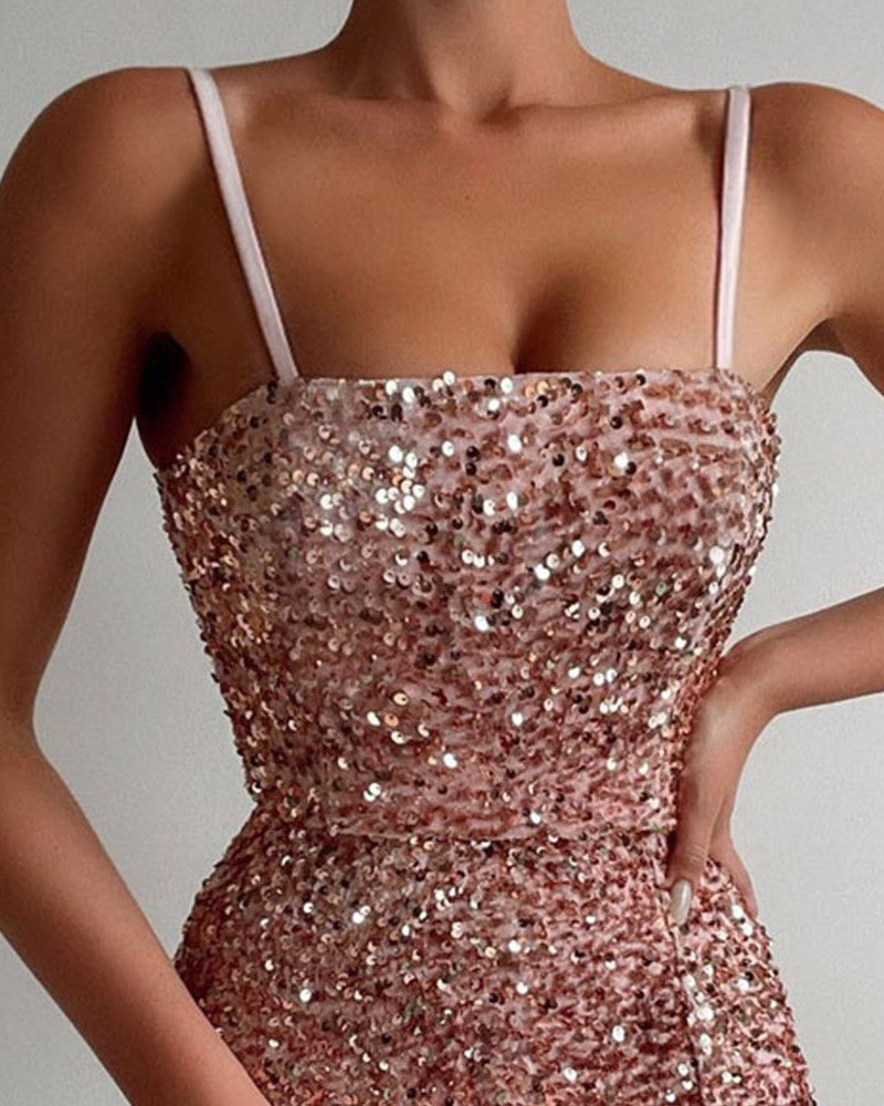 Roze mini -jurk met spaghetti -riemen en pailletten