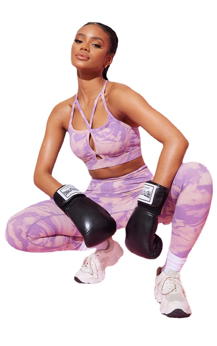 Train in stijl met de tweedelige crop -top van de dames en leggings set met een dromerige paars en licht lavendel kleurenschema en een unieke strappy halslijn.
