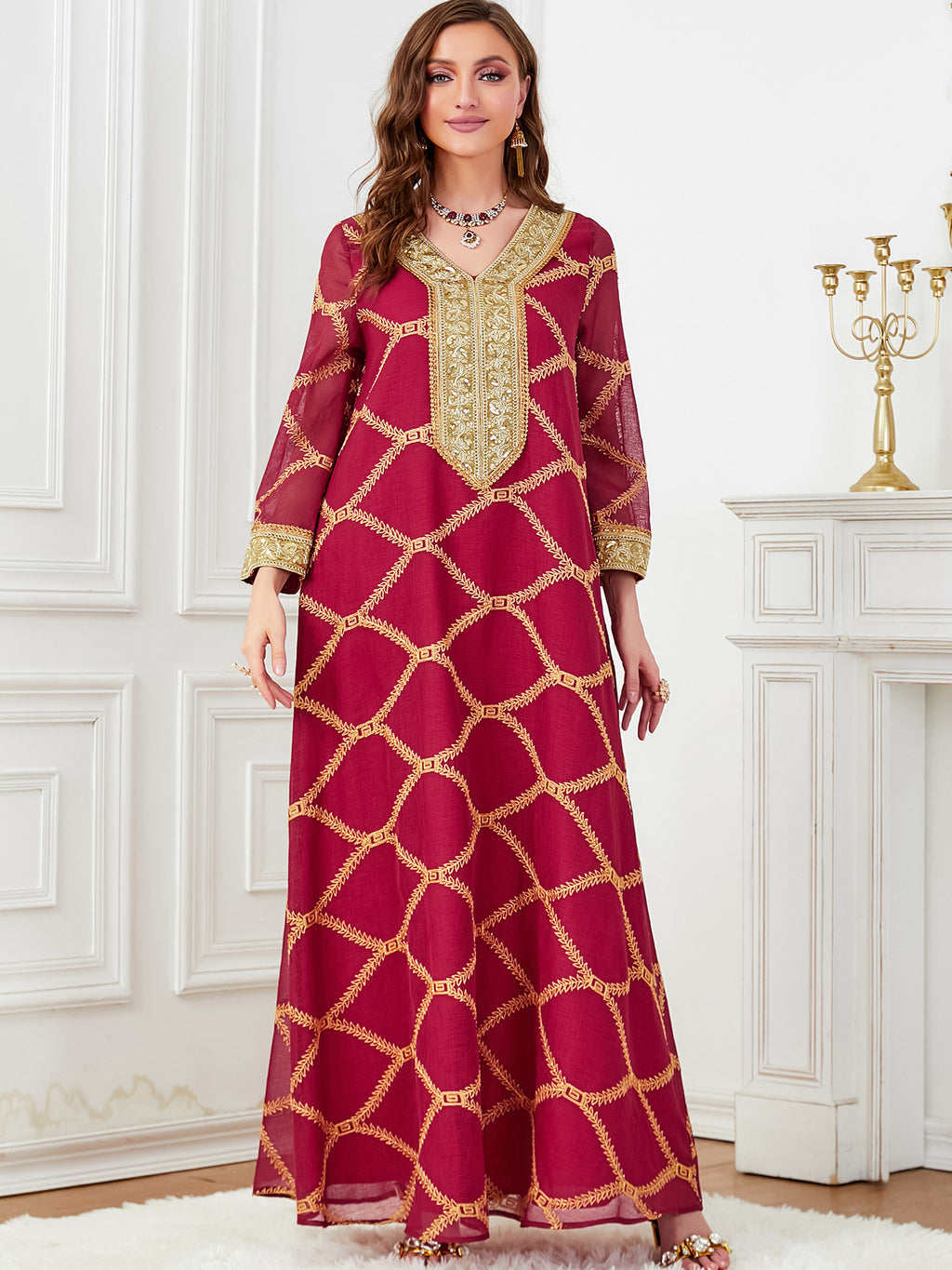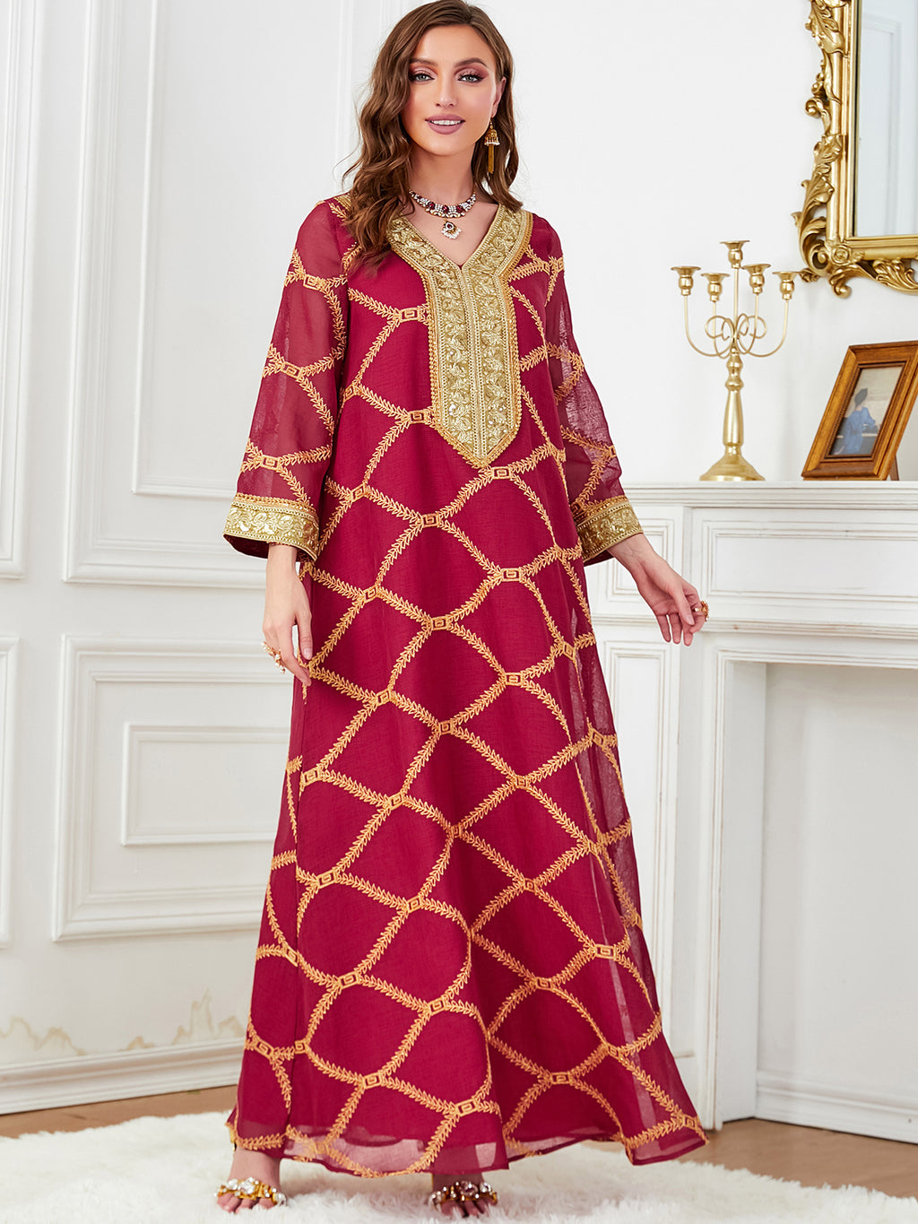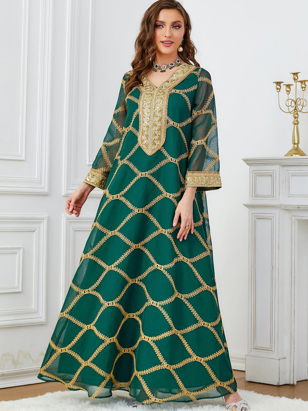 Dames smaragdgroene en gouden maxi -jurk met lange mouwen