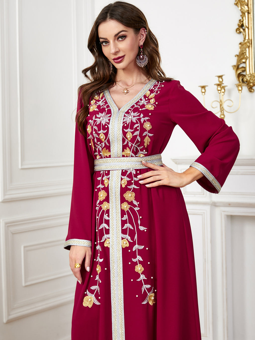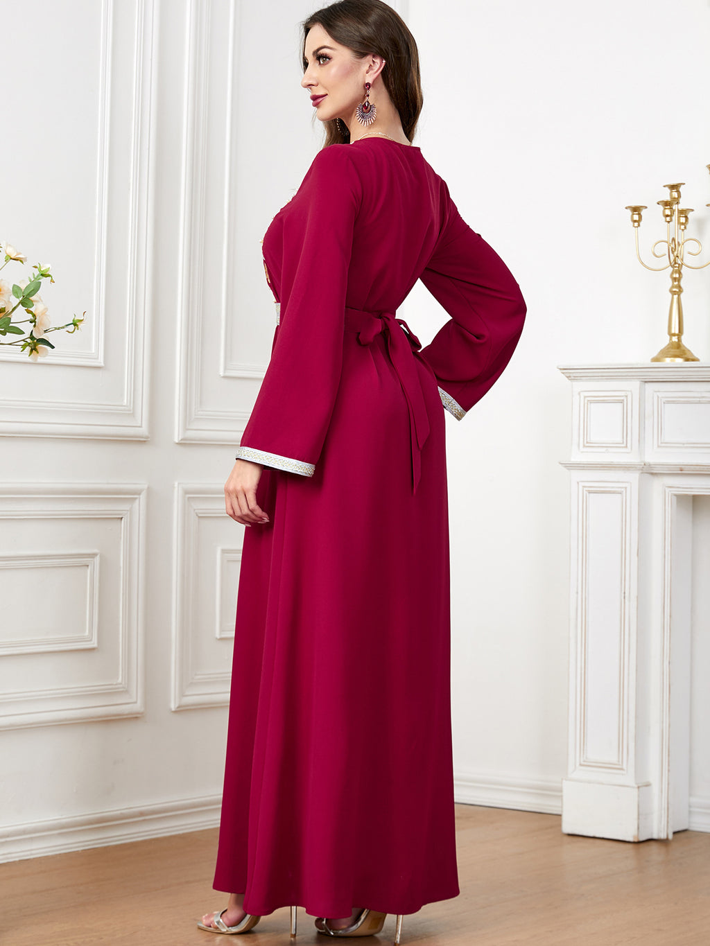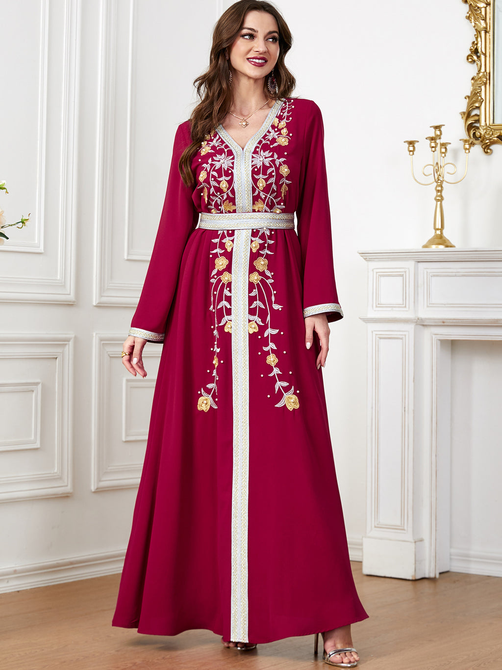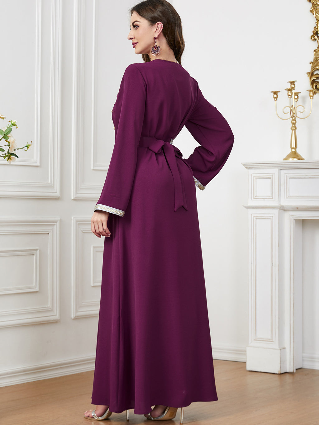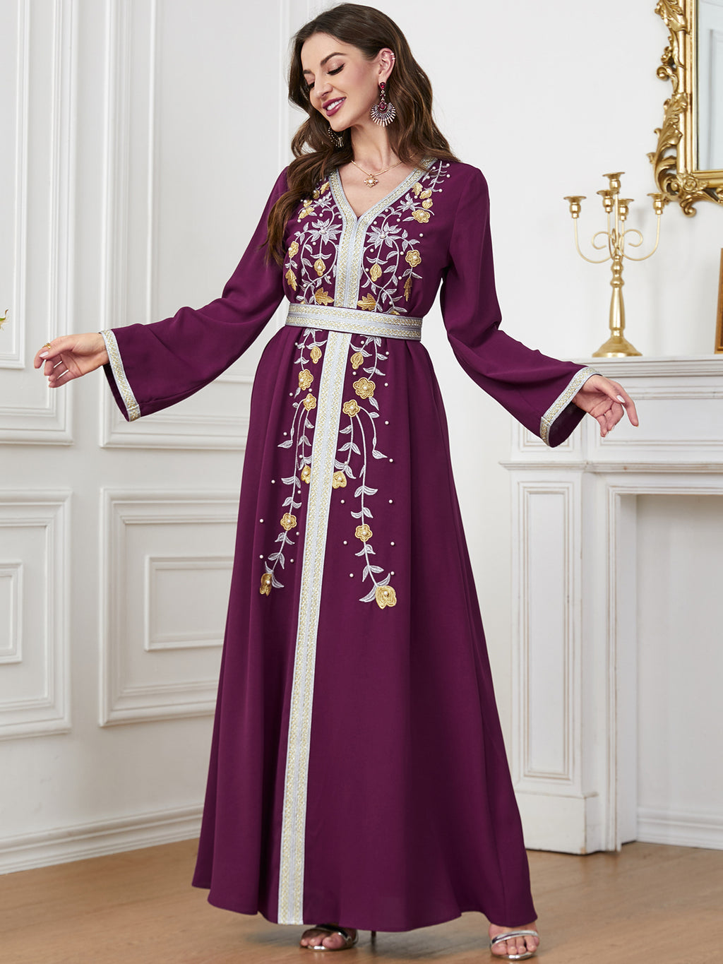 Maak een memorabele mode -statement met de maxi -jurk met lange mouwen met lange mouwen met sierlijke botanische details langs de voorkant. Het komt in paars, rood, blauw en groen.