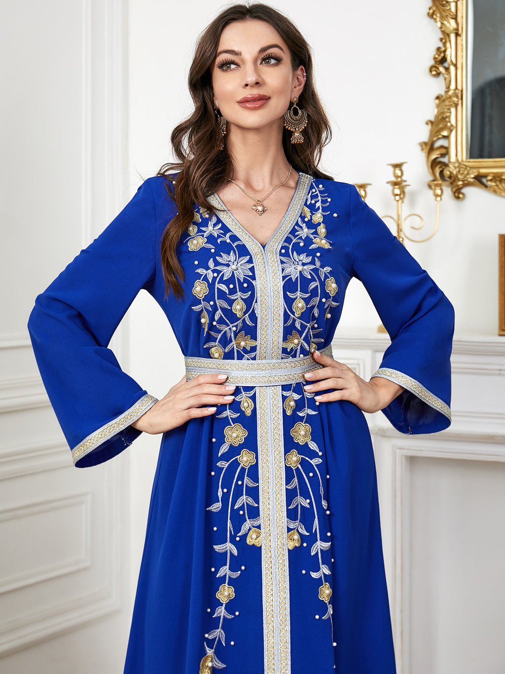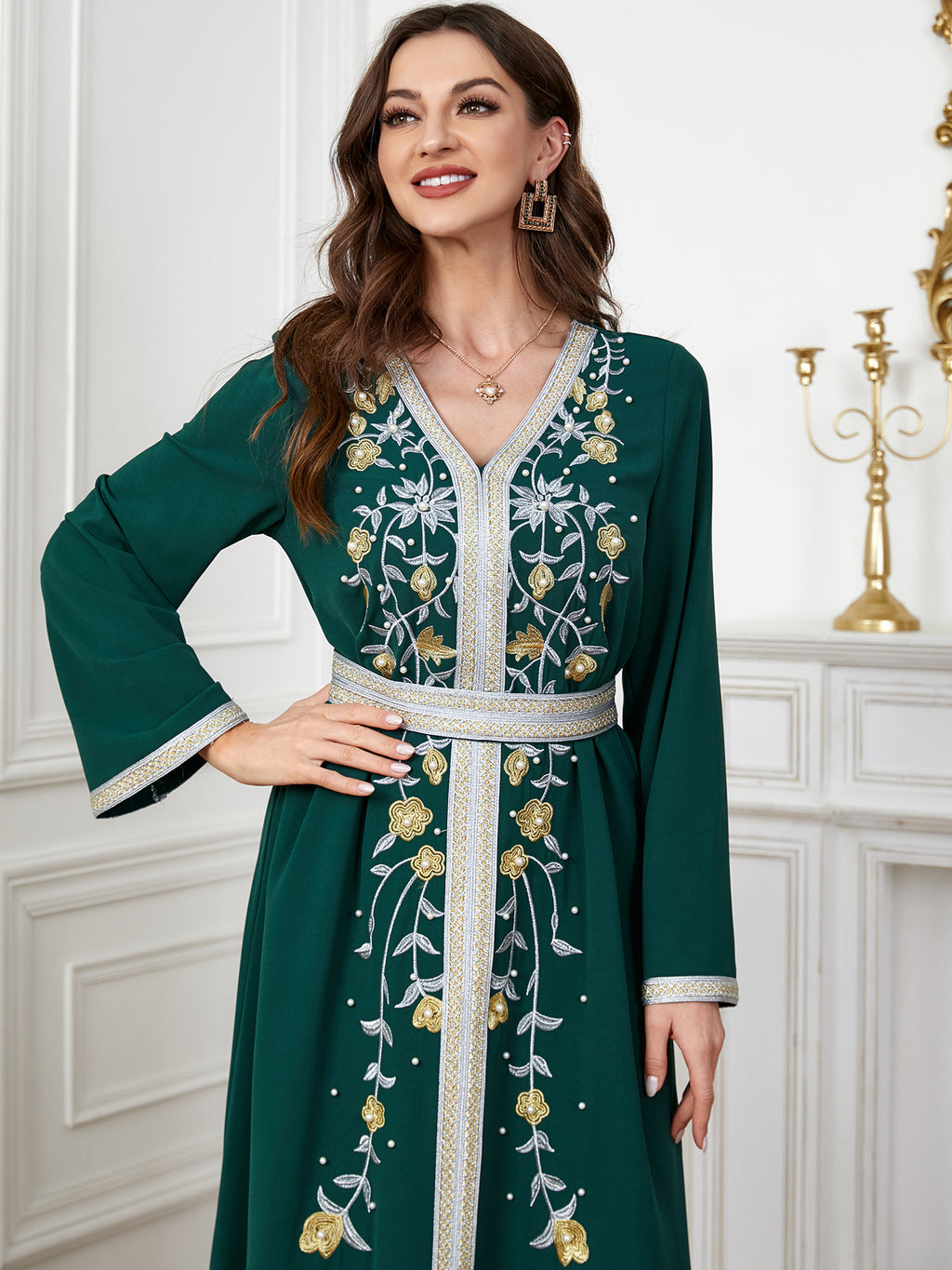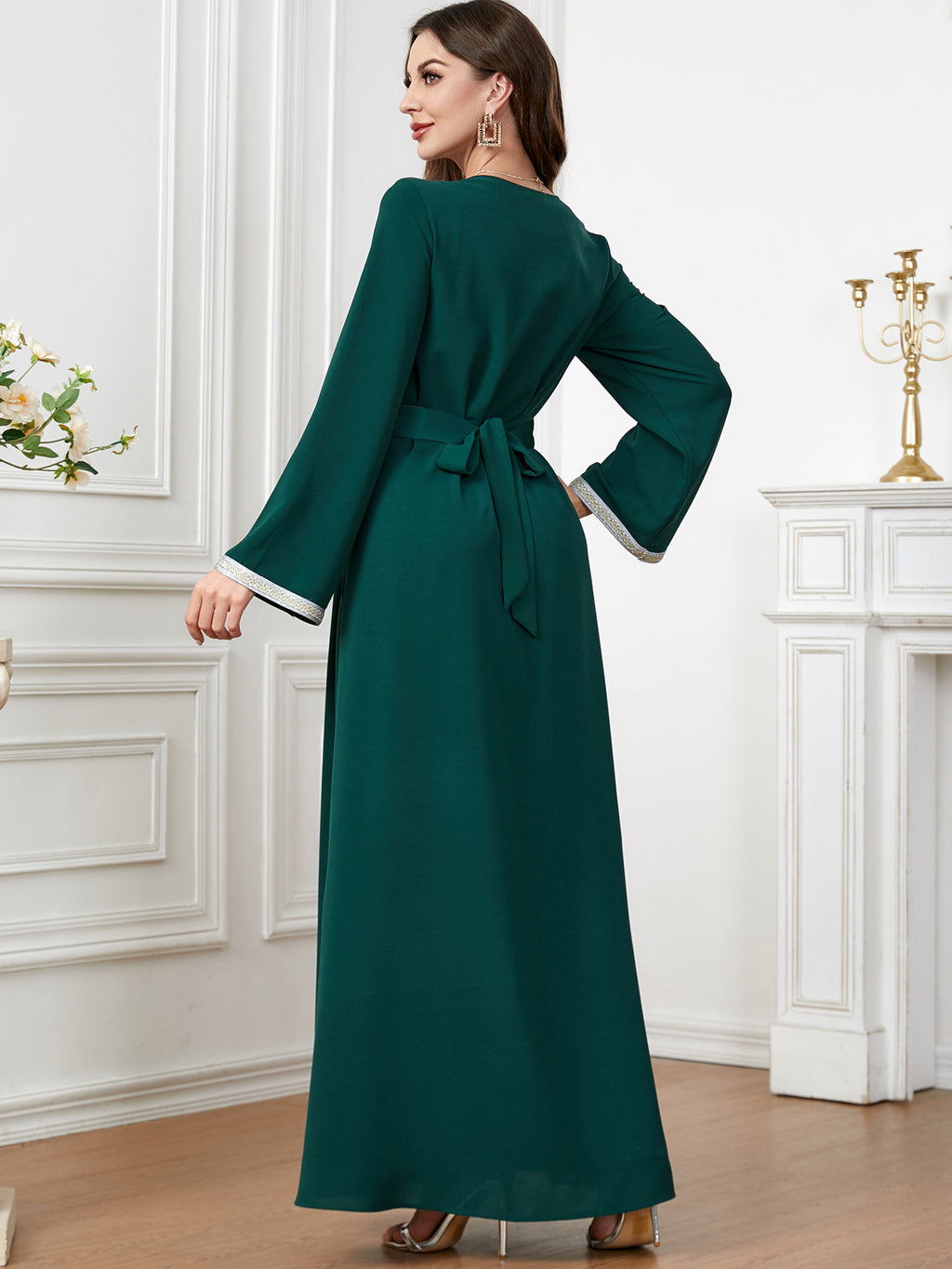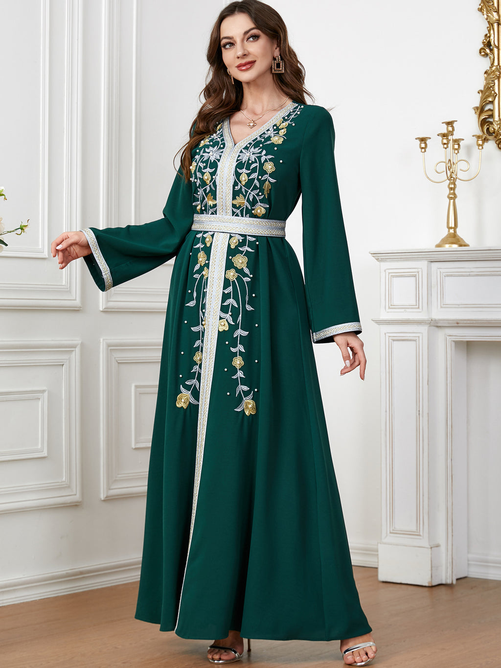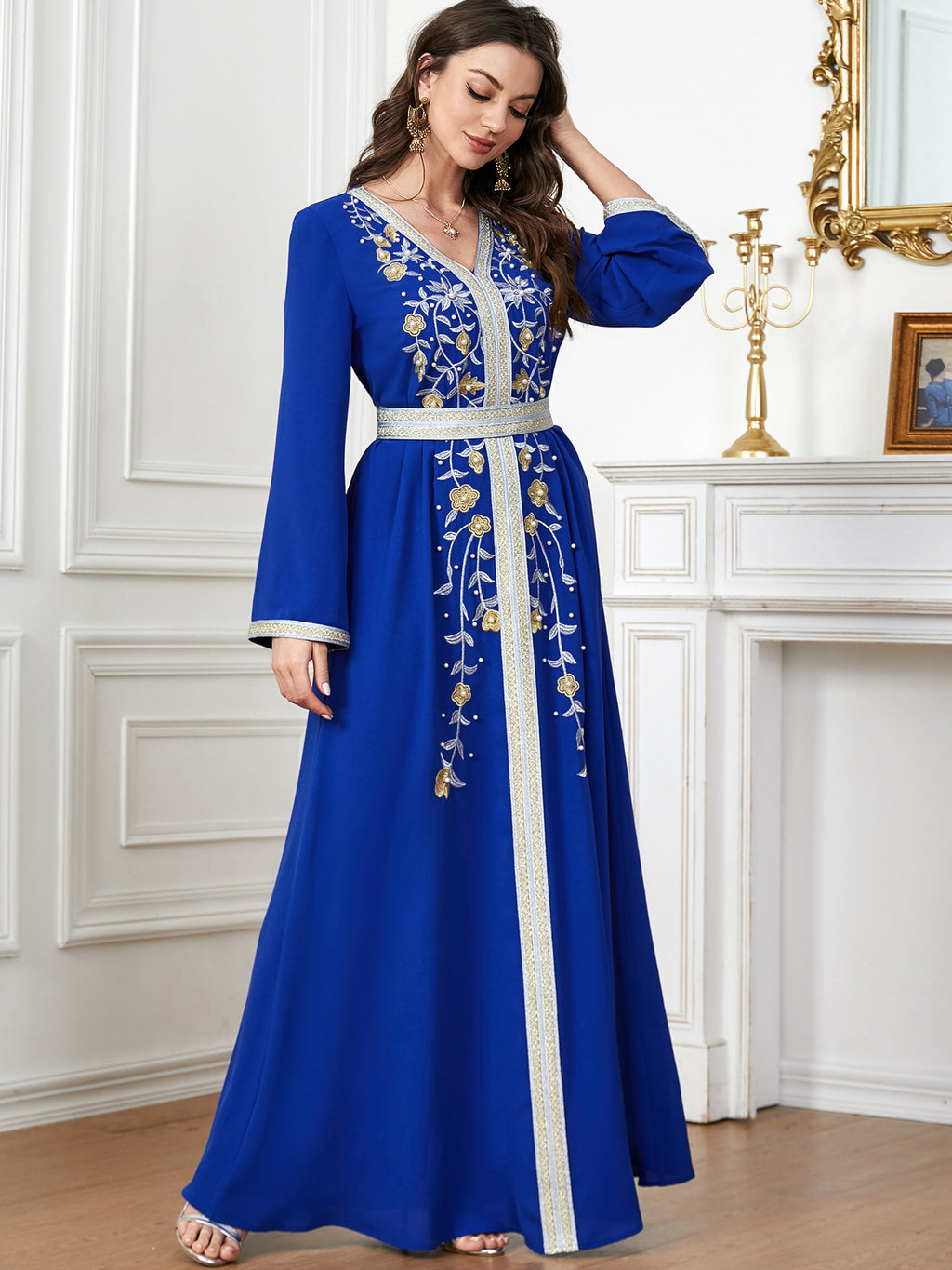 Maak een memorabele mode -statement met de maxi -jurk met lange mouwen met lange mouwen met sierlijke botanische details langs de voorkant. Het komt in paars, rood, blauw en groen.