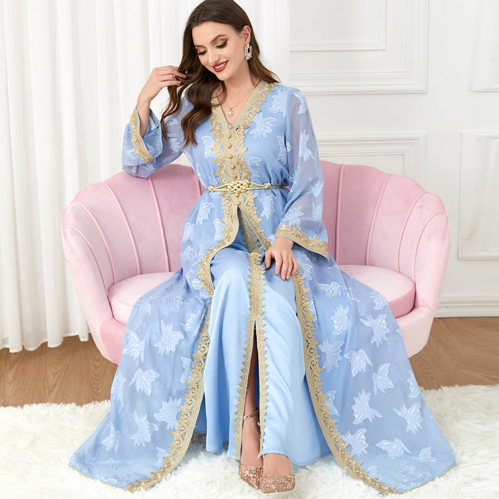Dames met lange mouw semi-kregen bloemenjurk met gouden afwerking