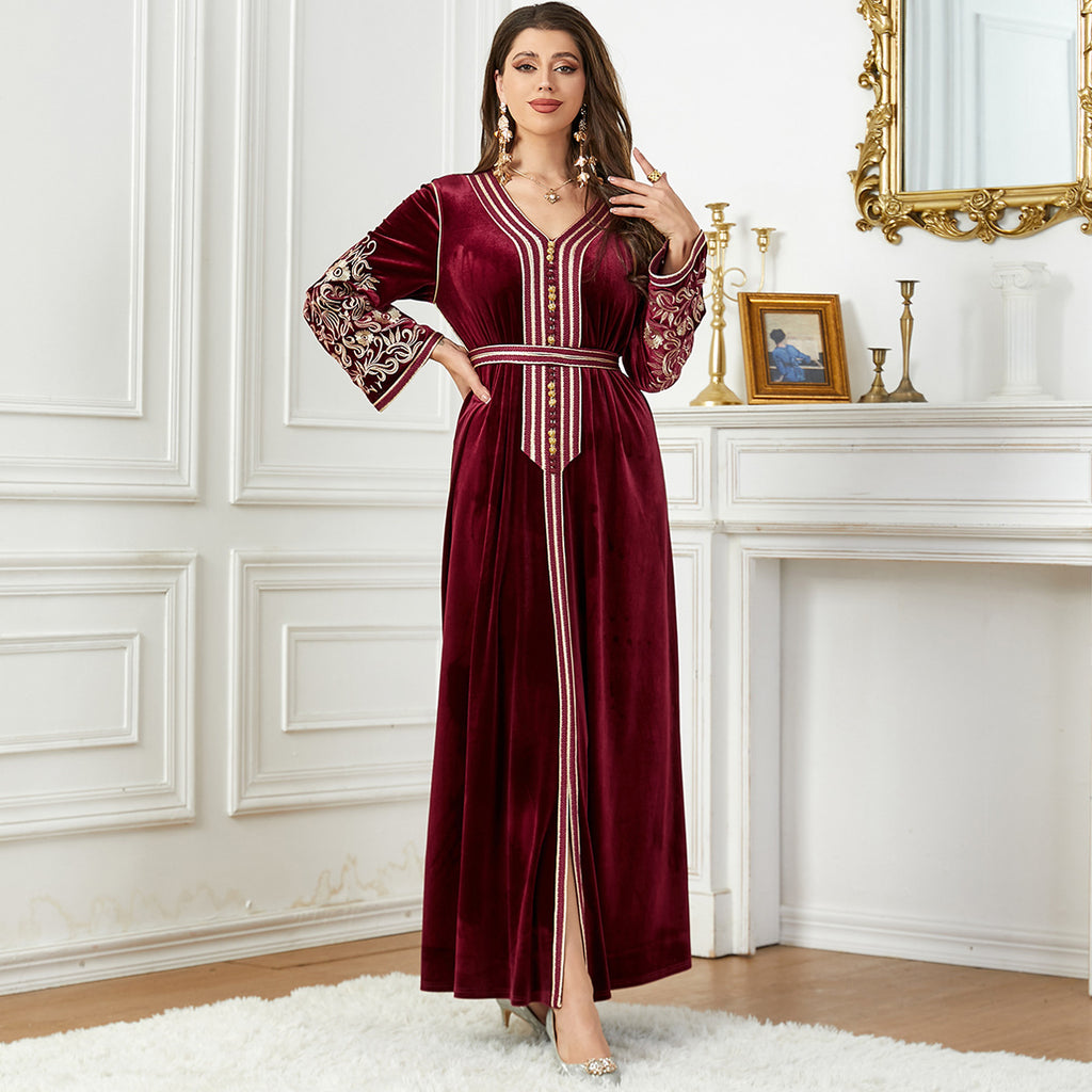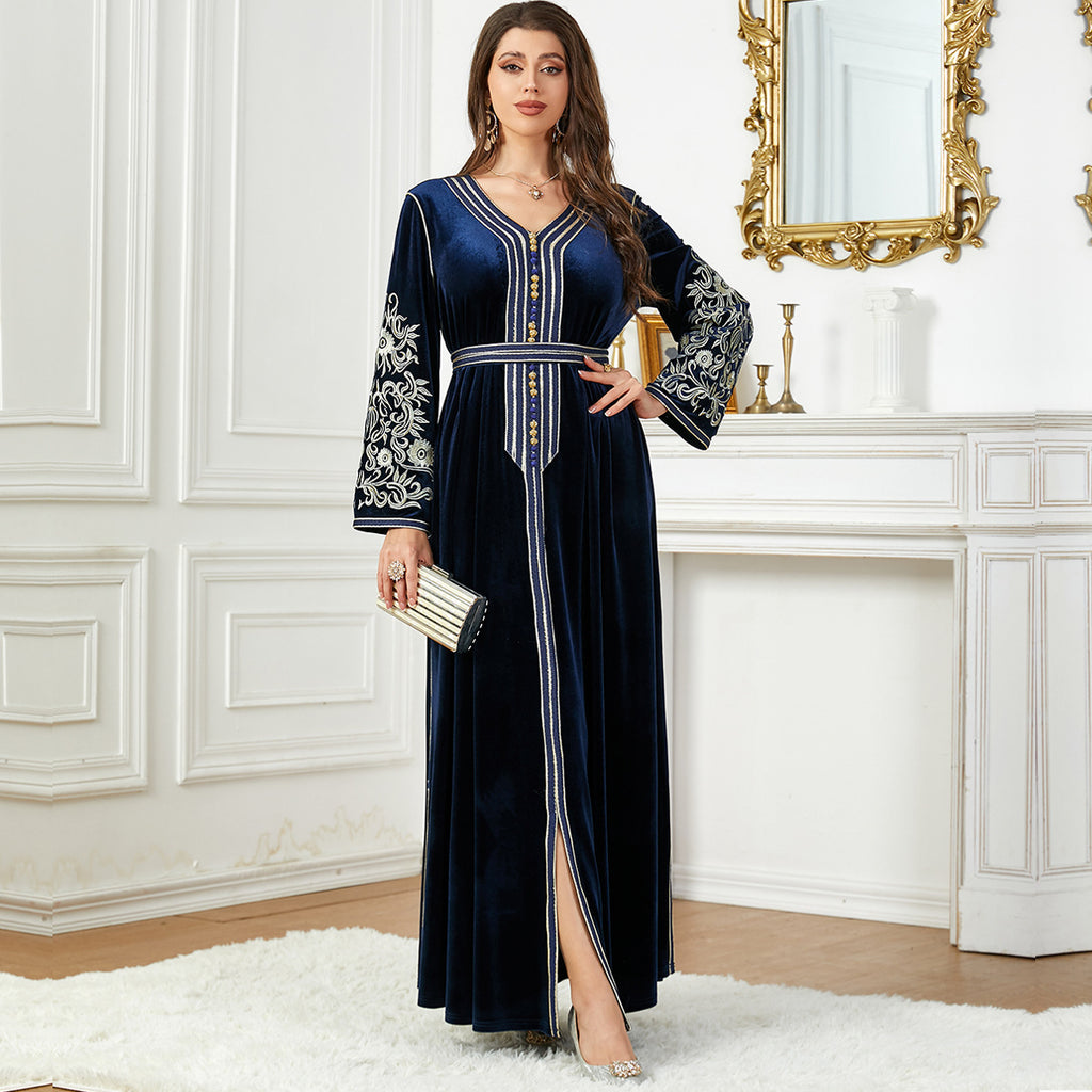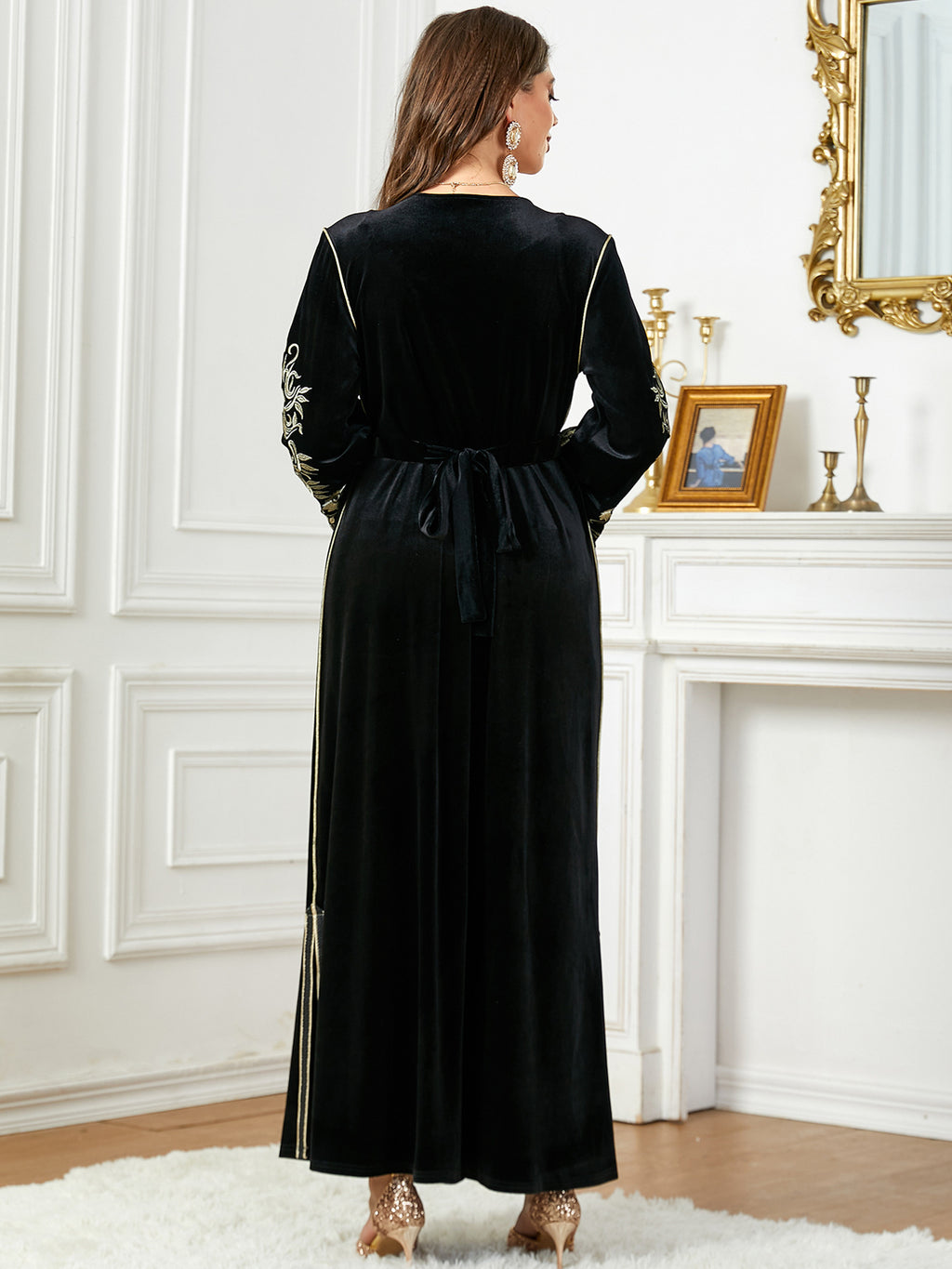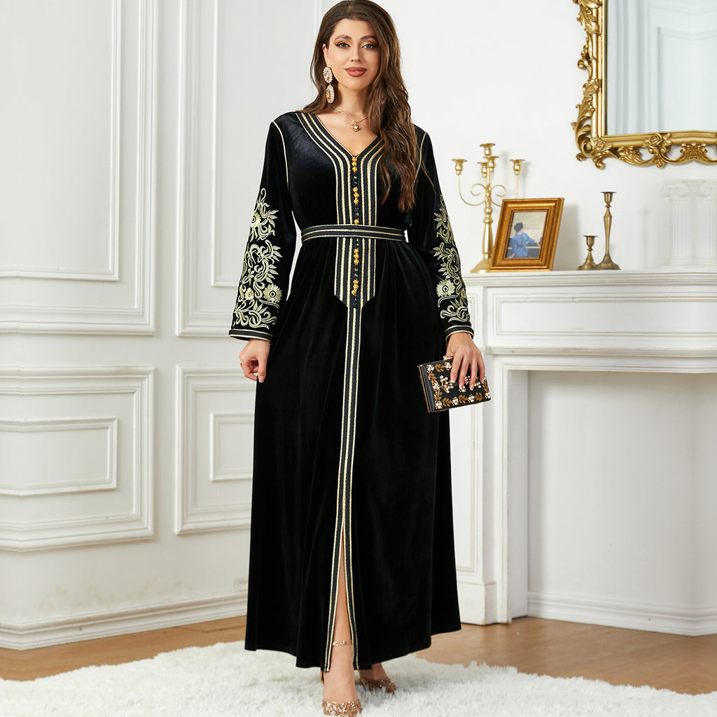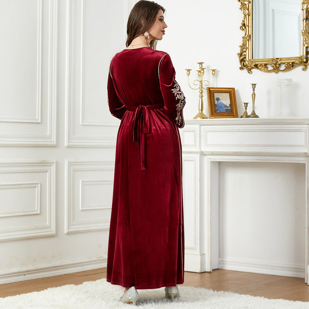 Dames met lange mouw fluwelen maxi -jurk met gouden details