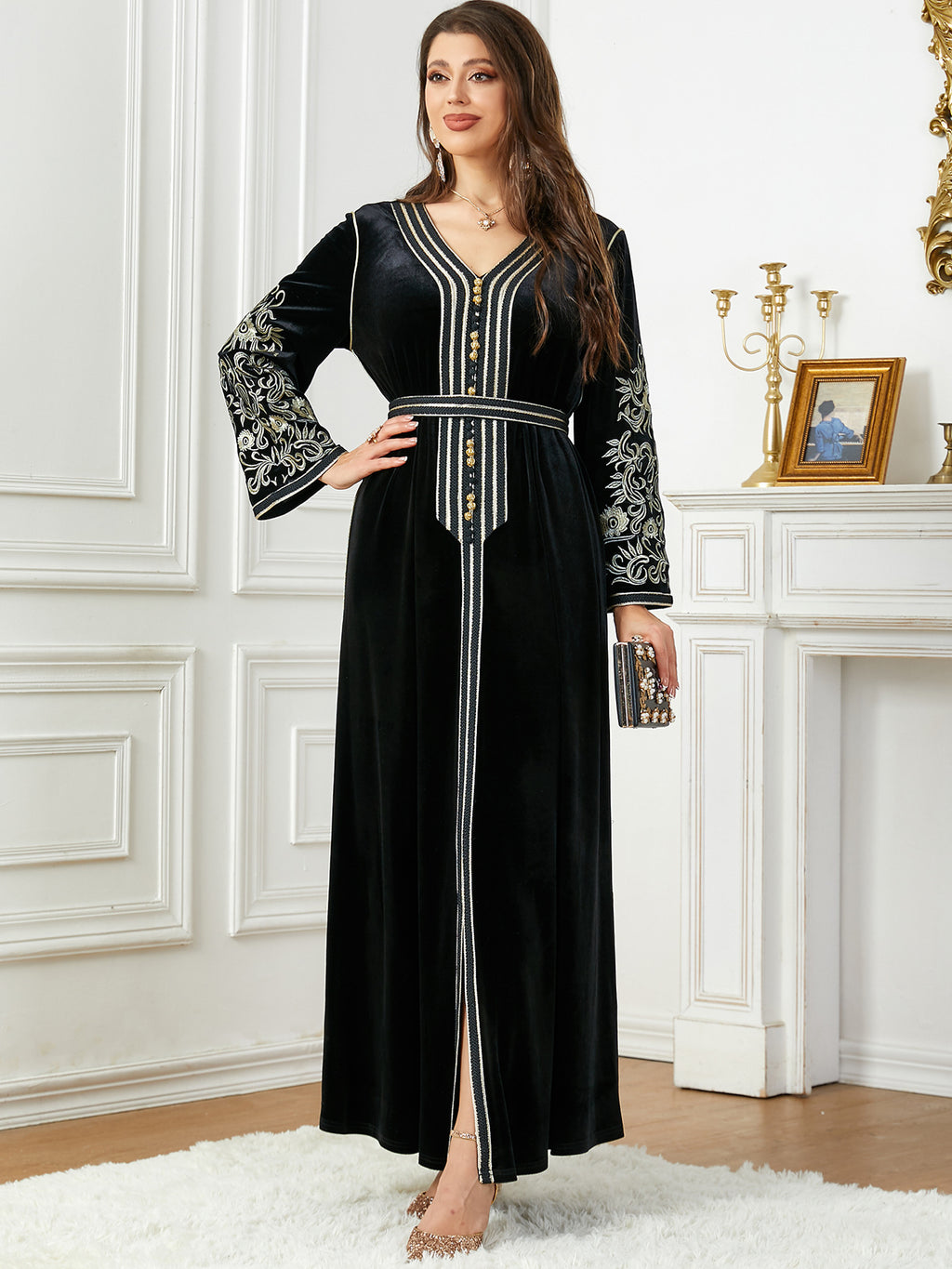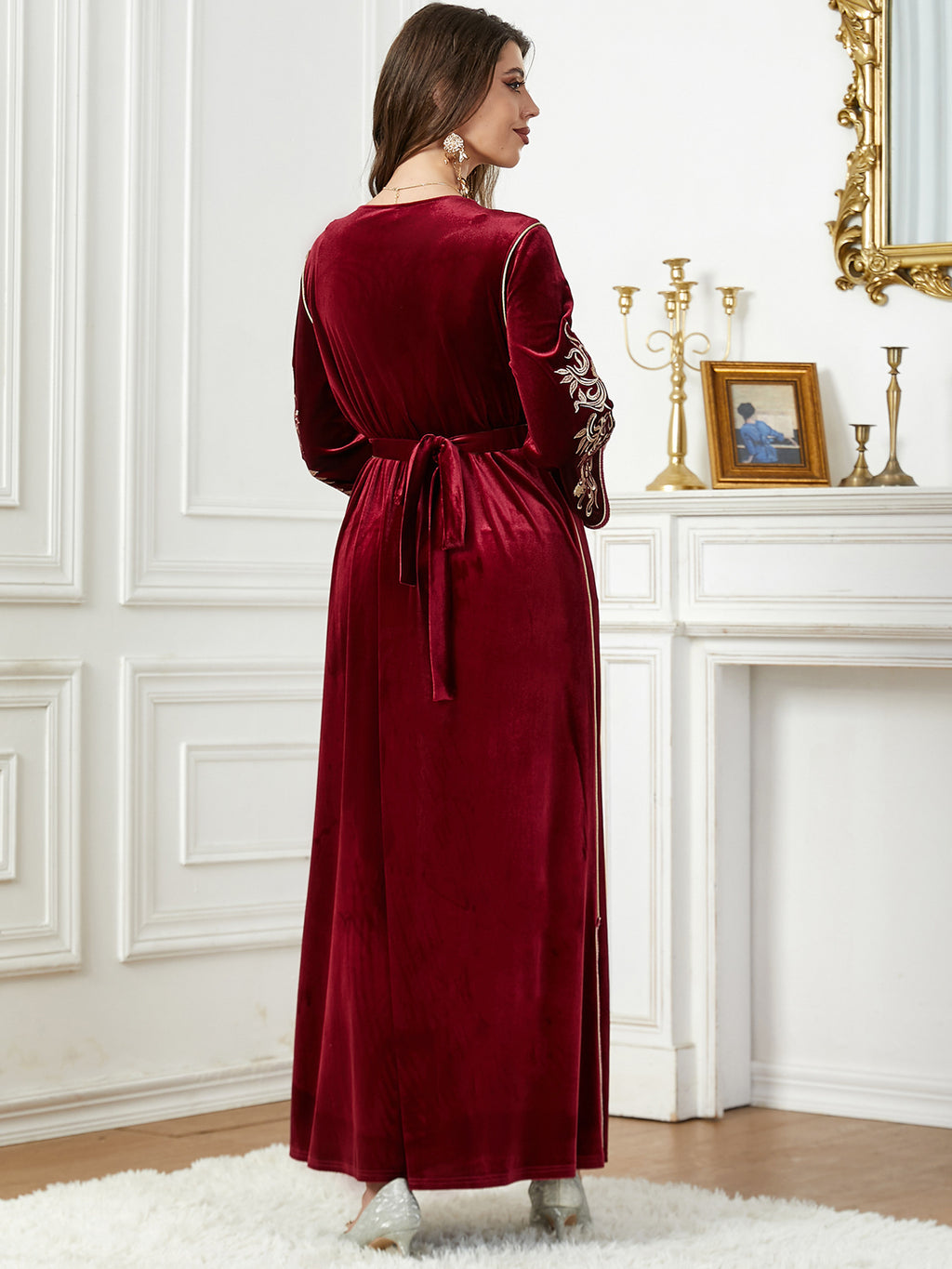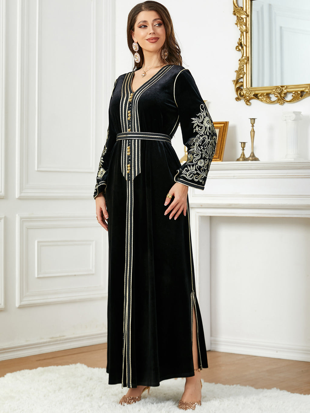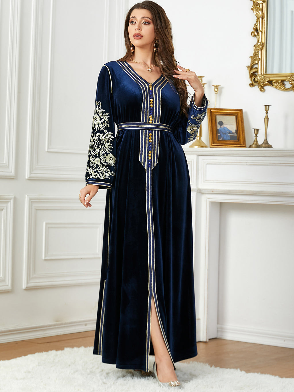 Dames met lange mouw fluwelen maxi -jurk met gouden details