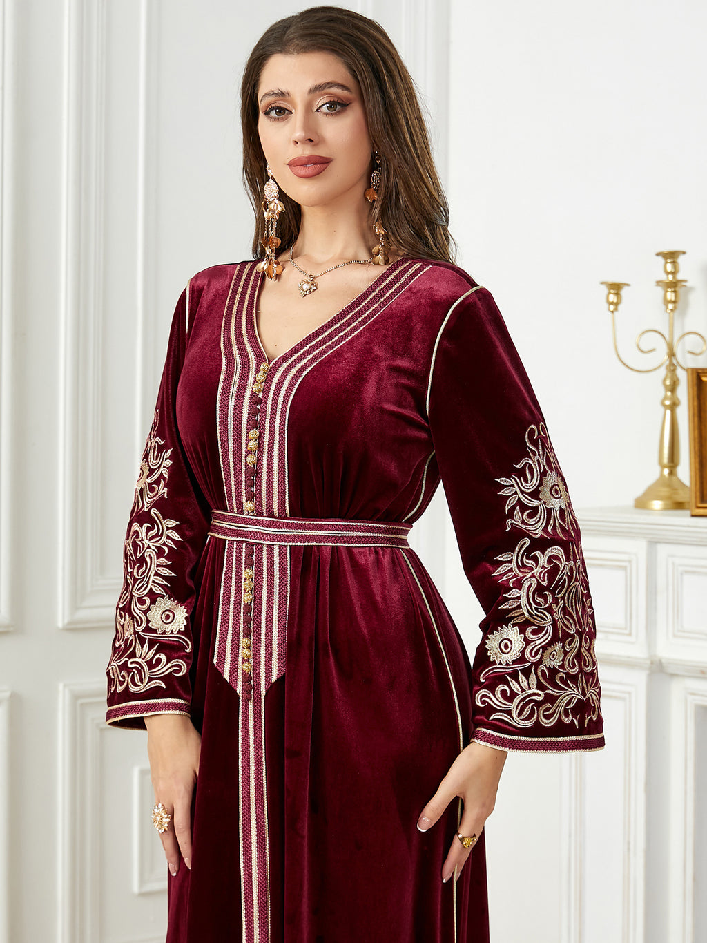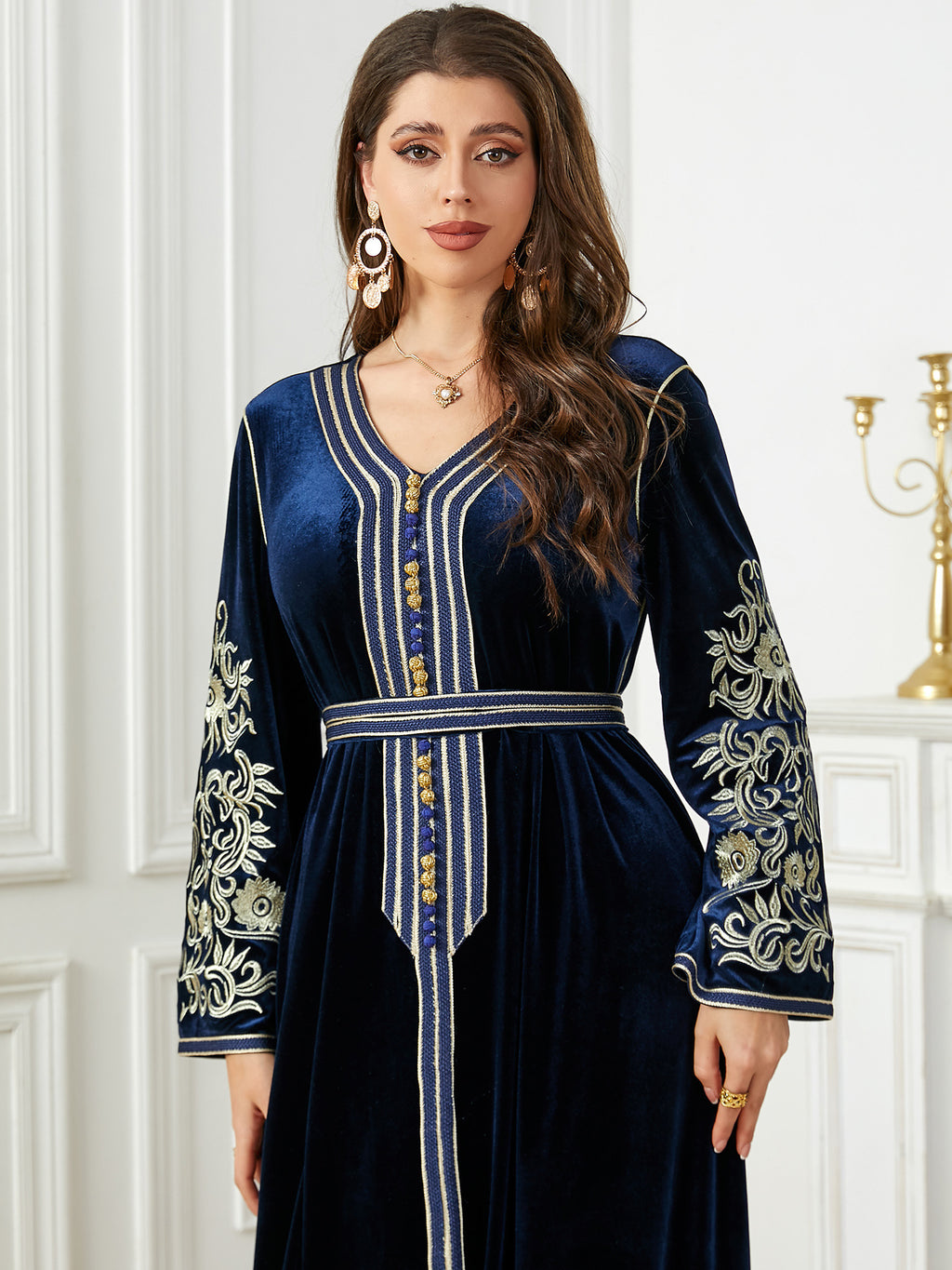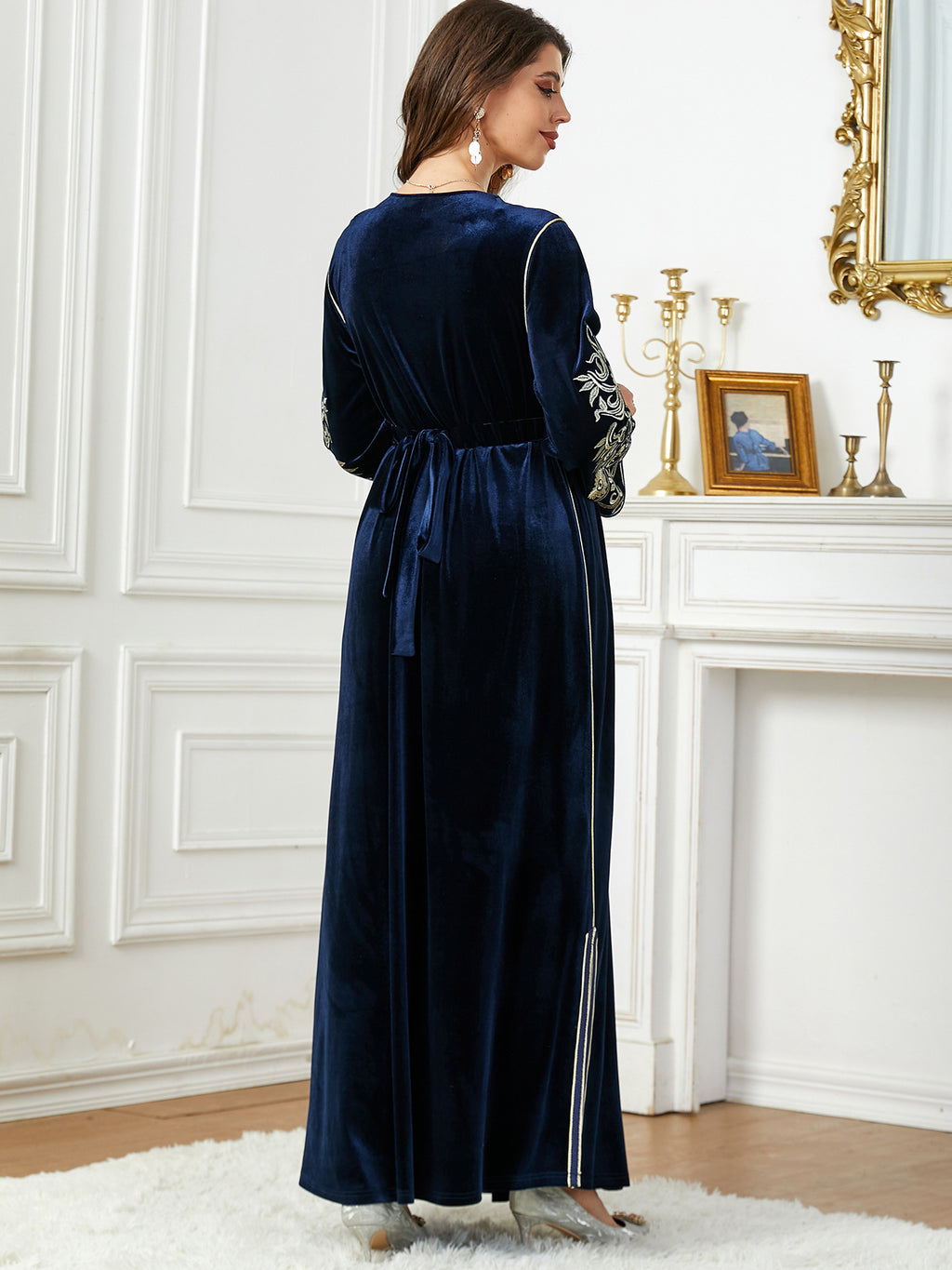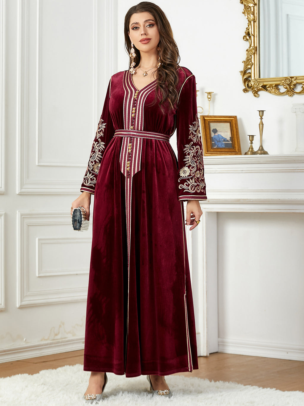 Dames met lange mouw fluwelen maxi -jurk met gouden details