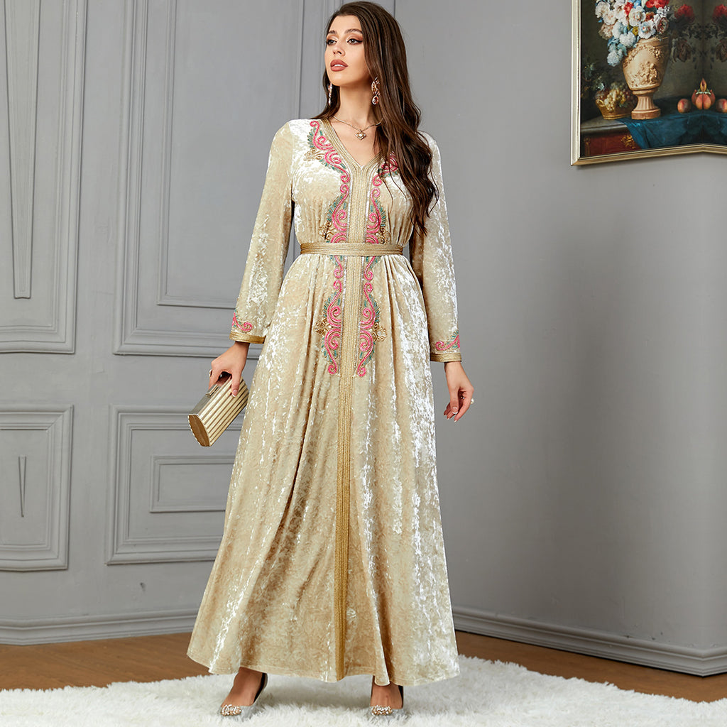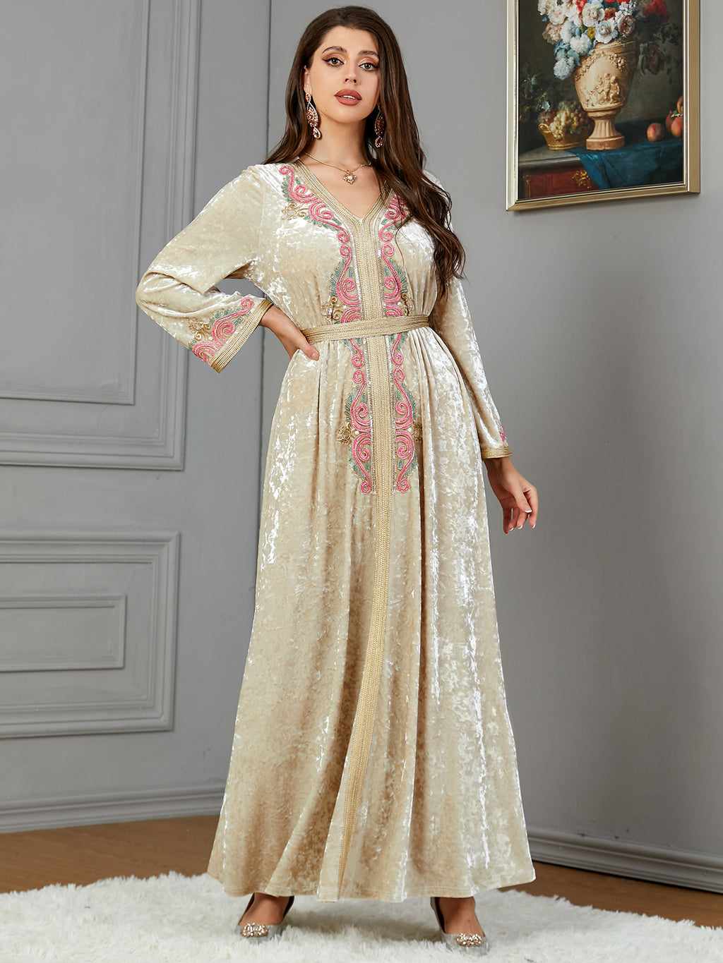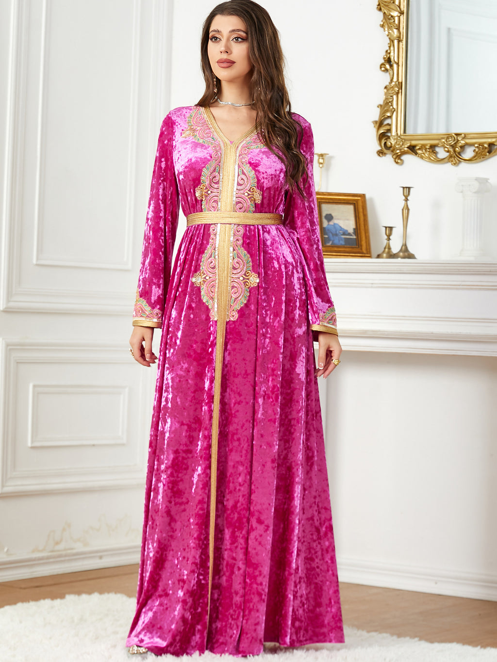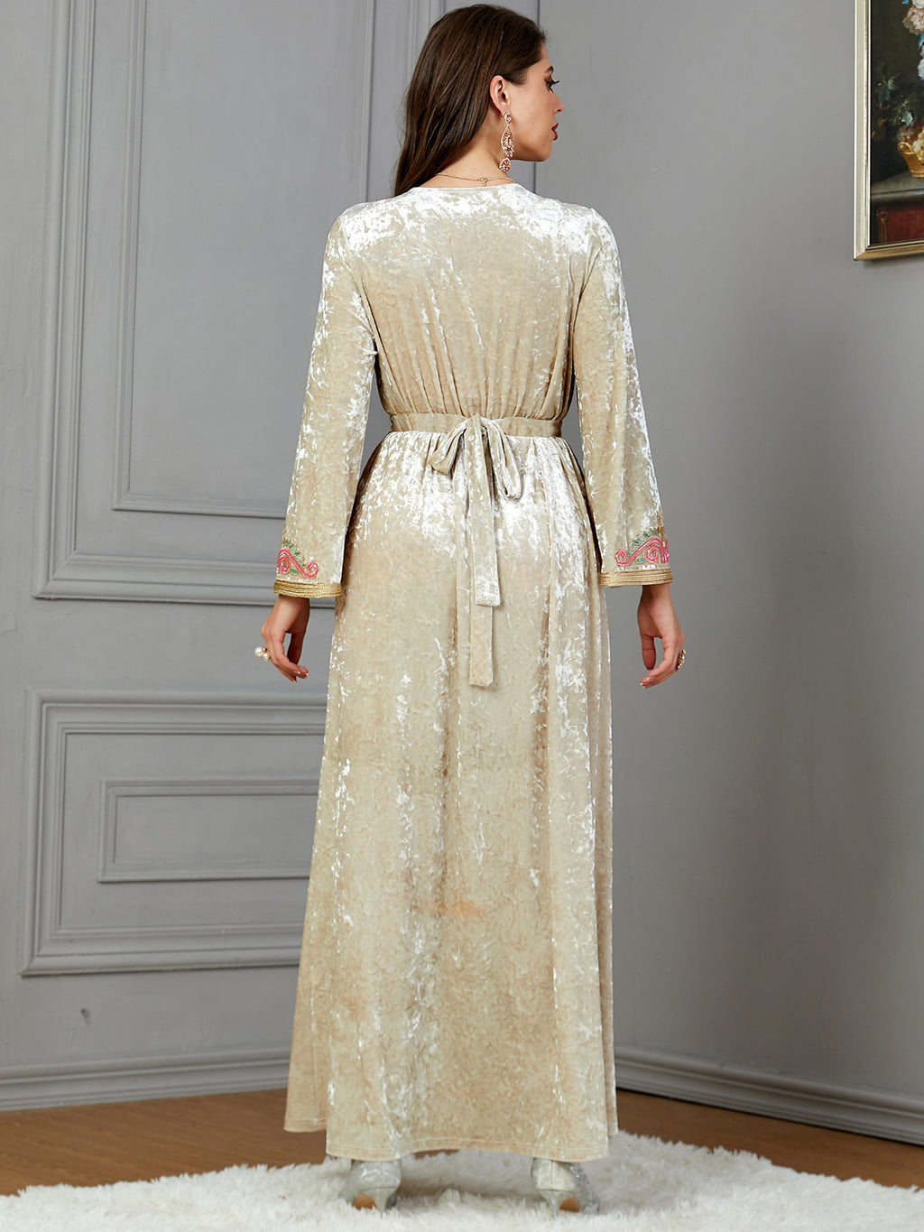 Dames met lange mouw fluwelen maxi -jurk met gouden afwerking