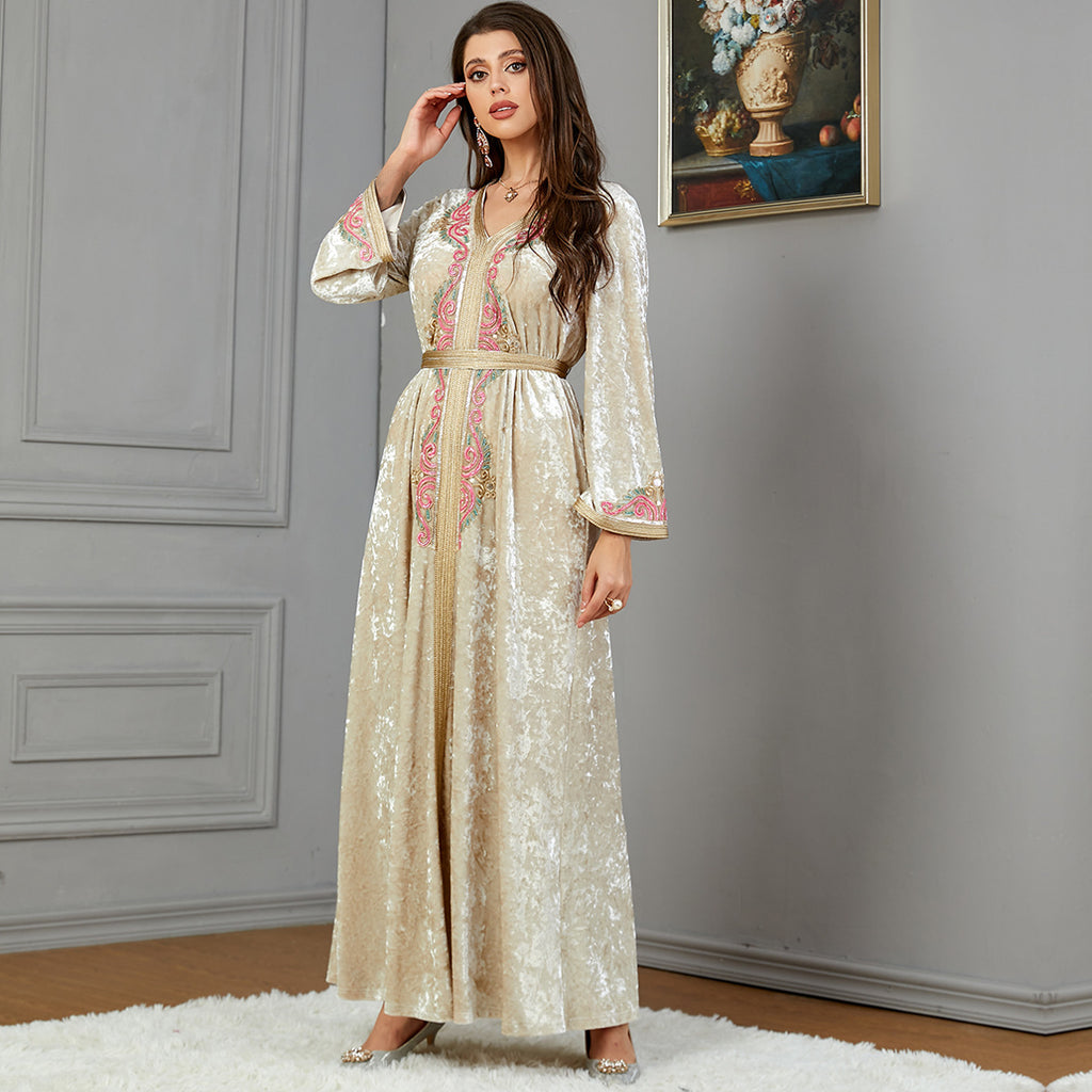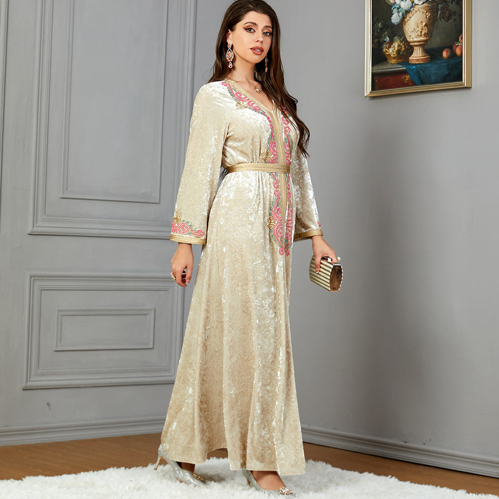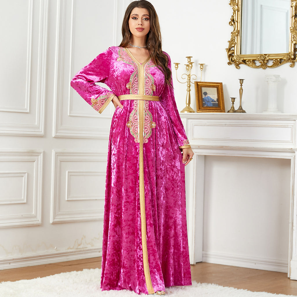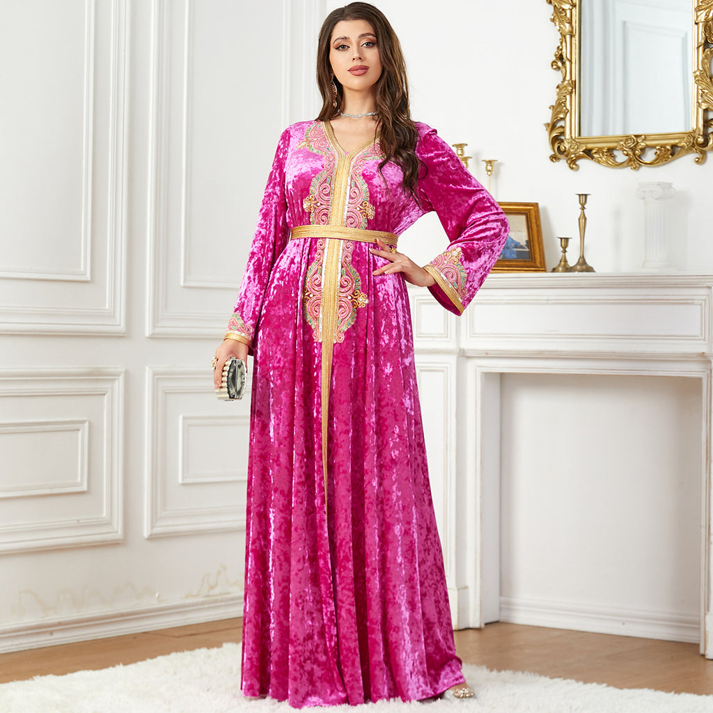 Dames met lange mouw fluwelen maxi -jurk met gouden afwerking