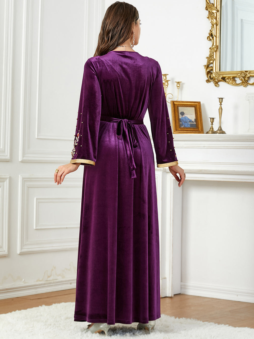 Dames met lange mouw fluwelen maxi -jurk met gouden afwerking