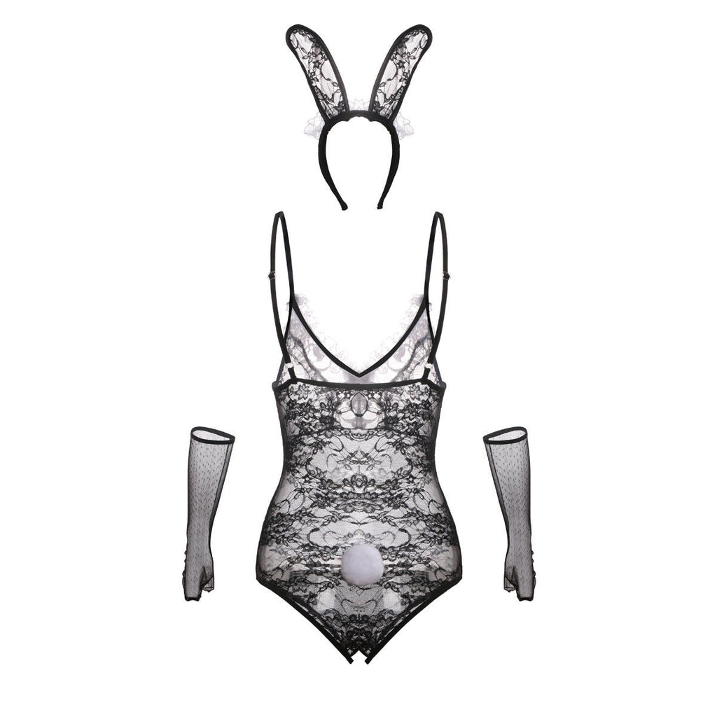 Play up your lover's playboy fantasies when you slip on this Bunny Foofoo Lace Lingerie Costume complete with bunny ears and mesh gloves.