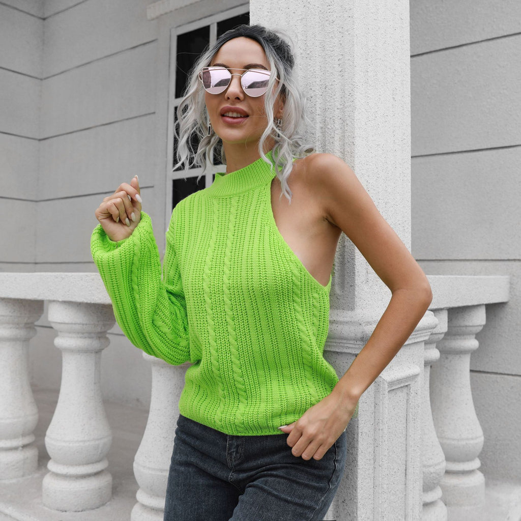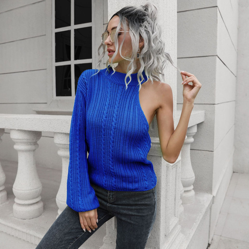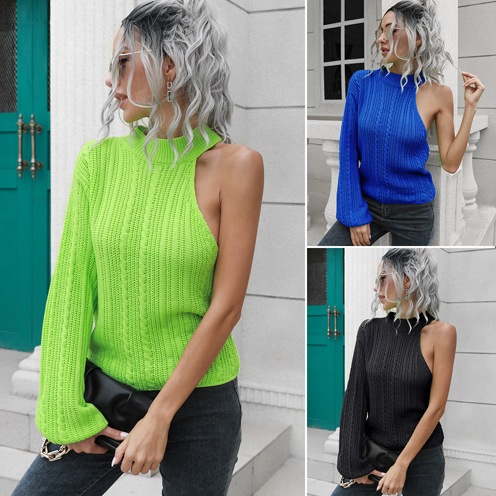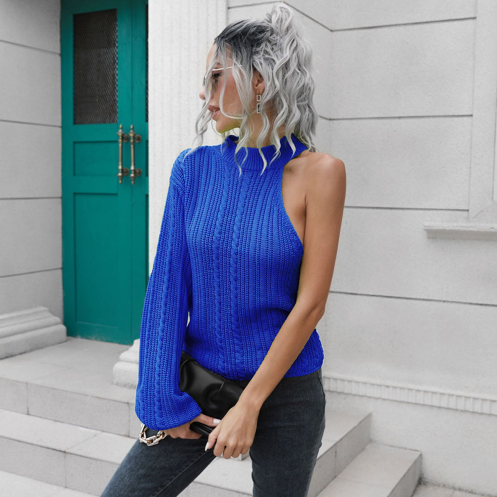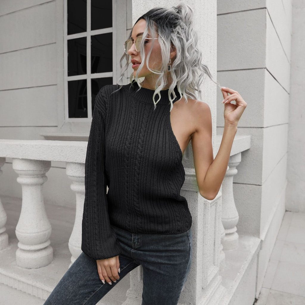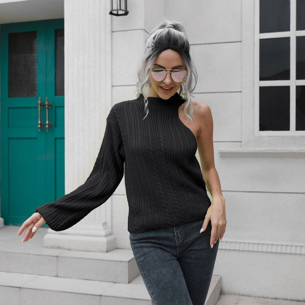 Make an eye-catching statement this fall wearing the Women's Single Sleeve Mock Neck Sweater with Knitted Details. It stands out with its one-sided sleeve and open arm on the other. It comes in three colors.