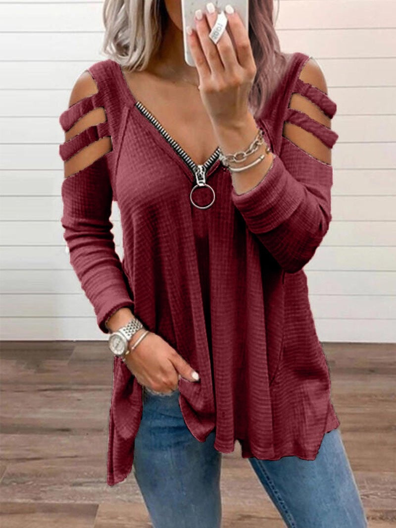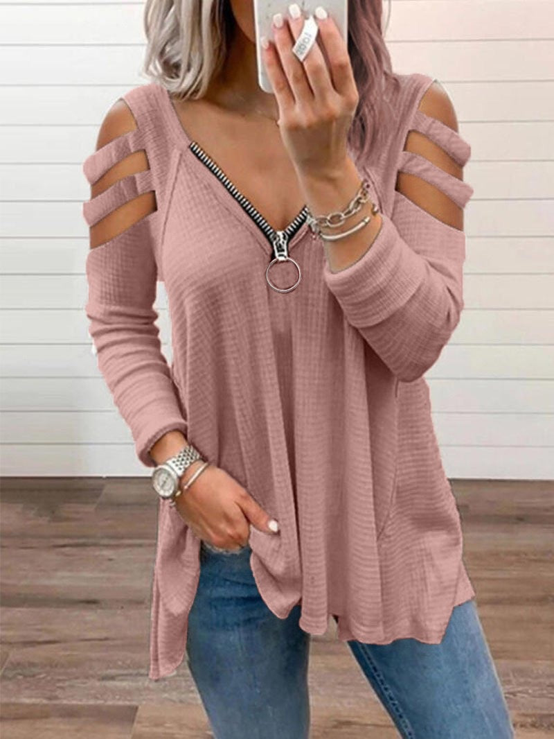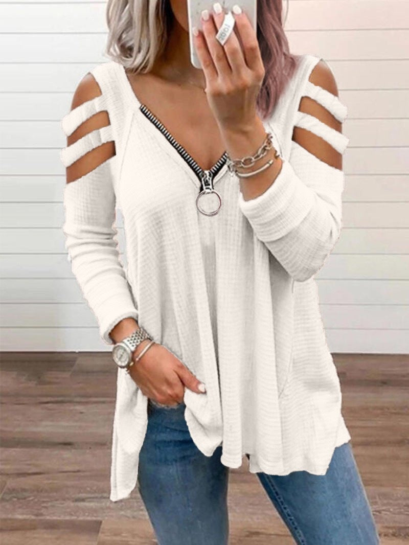 Women’s Long Sleeved Strappy Zipper V-Neck Top