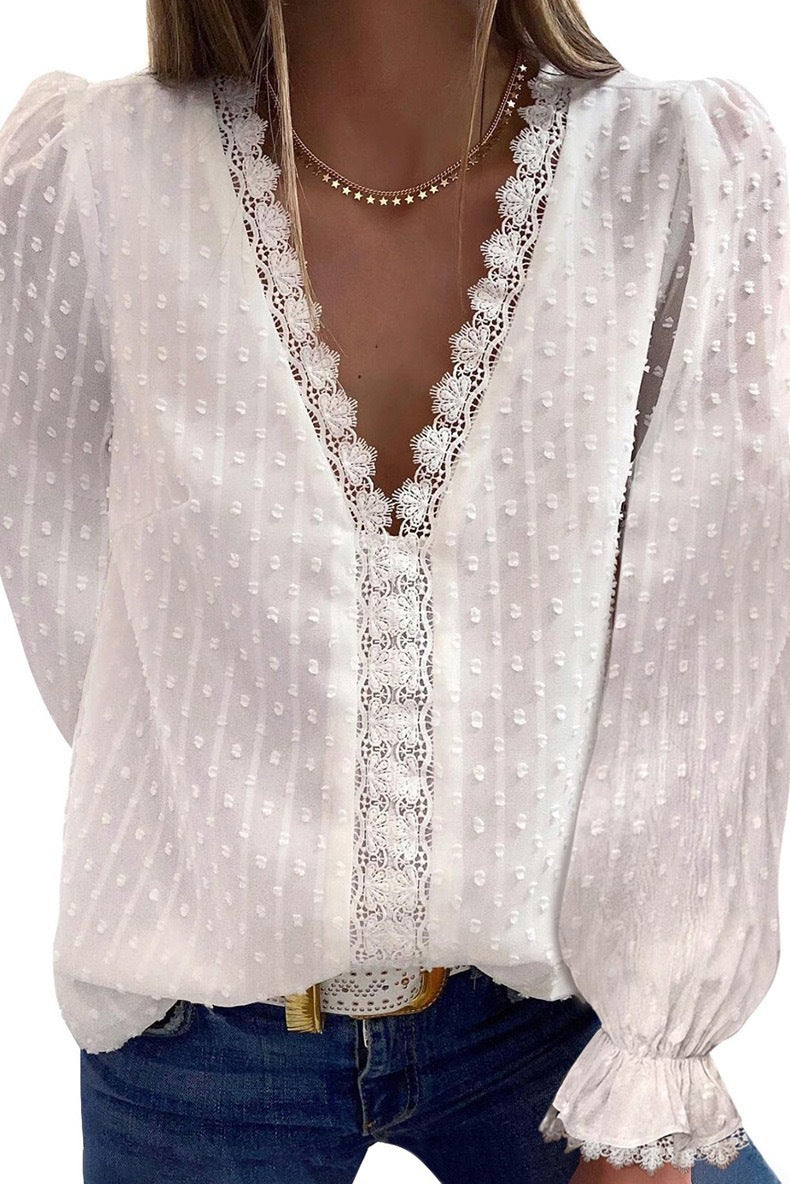 Lacy Pom Pom de manga longa Blusa de decote em V