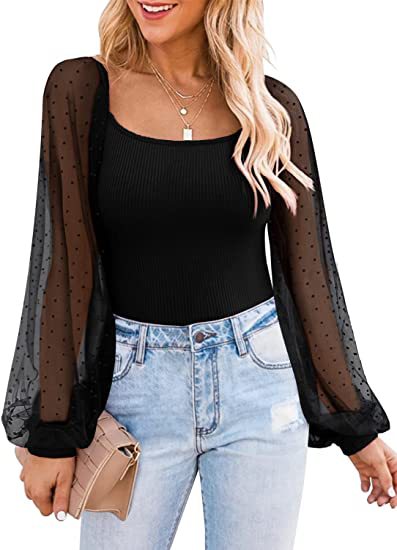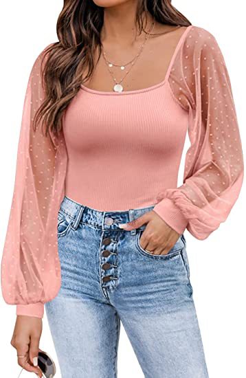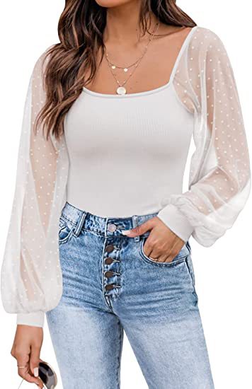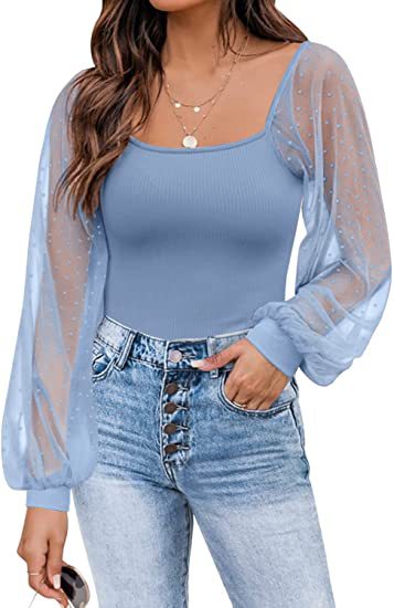 Mangas compridas de mangas compridas femininas Tops de pescoço quadrado