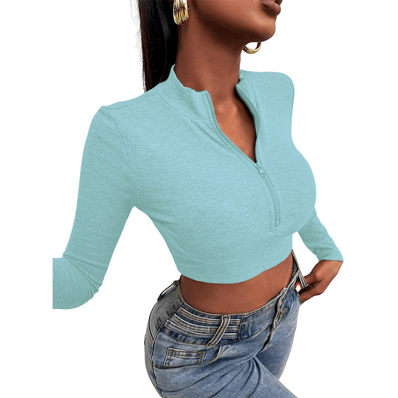 Dispoie sua figura nesta primavera e verão usando a blusa de decote em V Zipper com mangas compridas com um comprimento de corte, mangas compridas e um pescoço com zíper que permite personalizar sua aparência.
