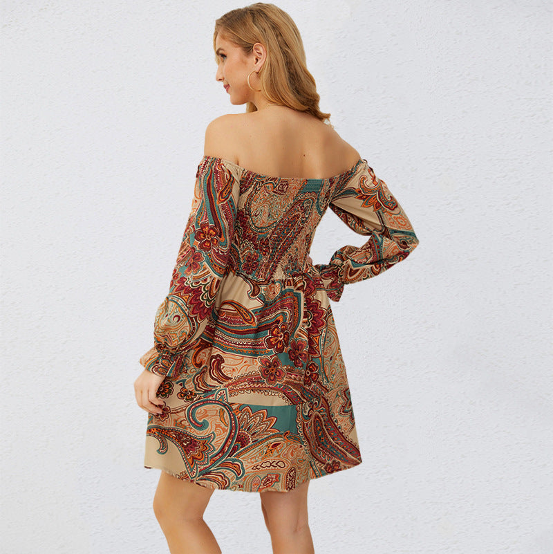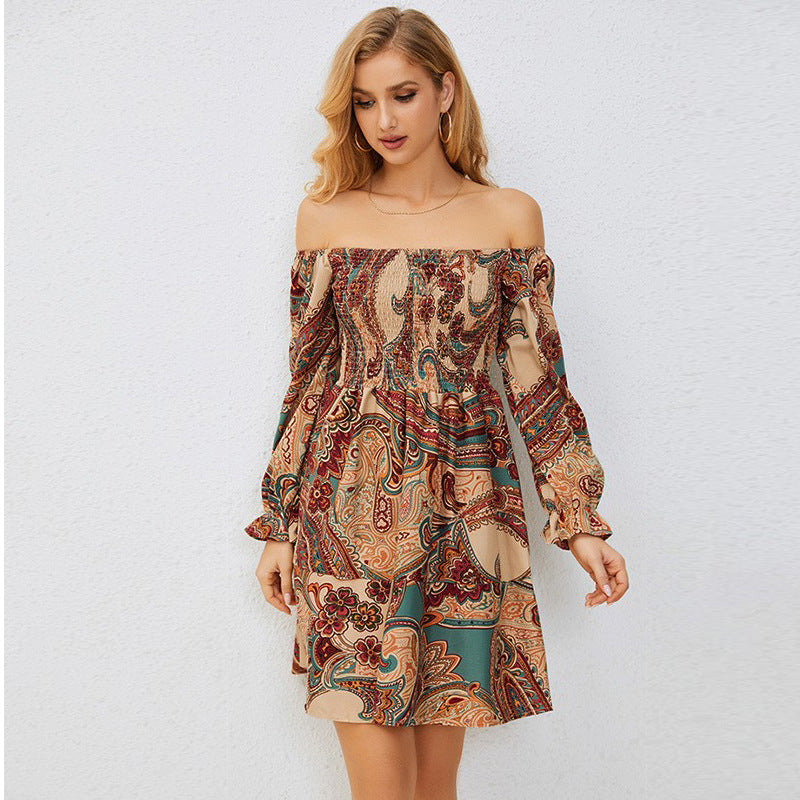 Look stylish in earth tones and paisley print wearing the Women's Off the Shoulder Long Sleeve Midi Dress featuring brown, crimson, orange and teal hues.